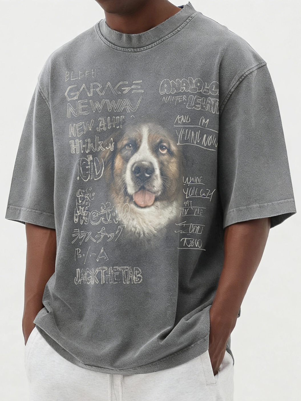Men's Washed & Distressed Pure Cotton Dog-Print T-Shirt