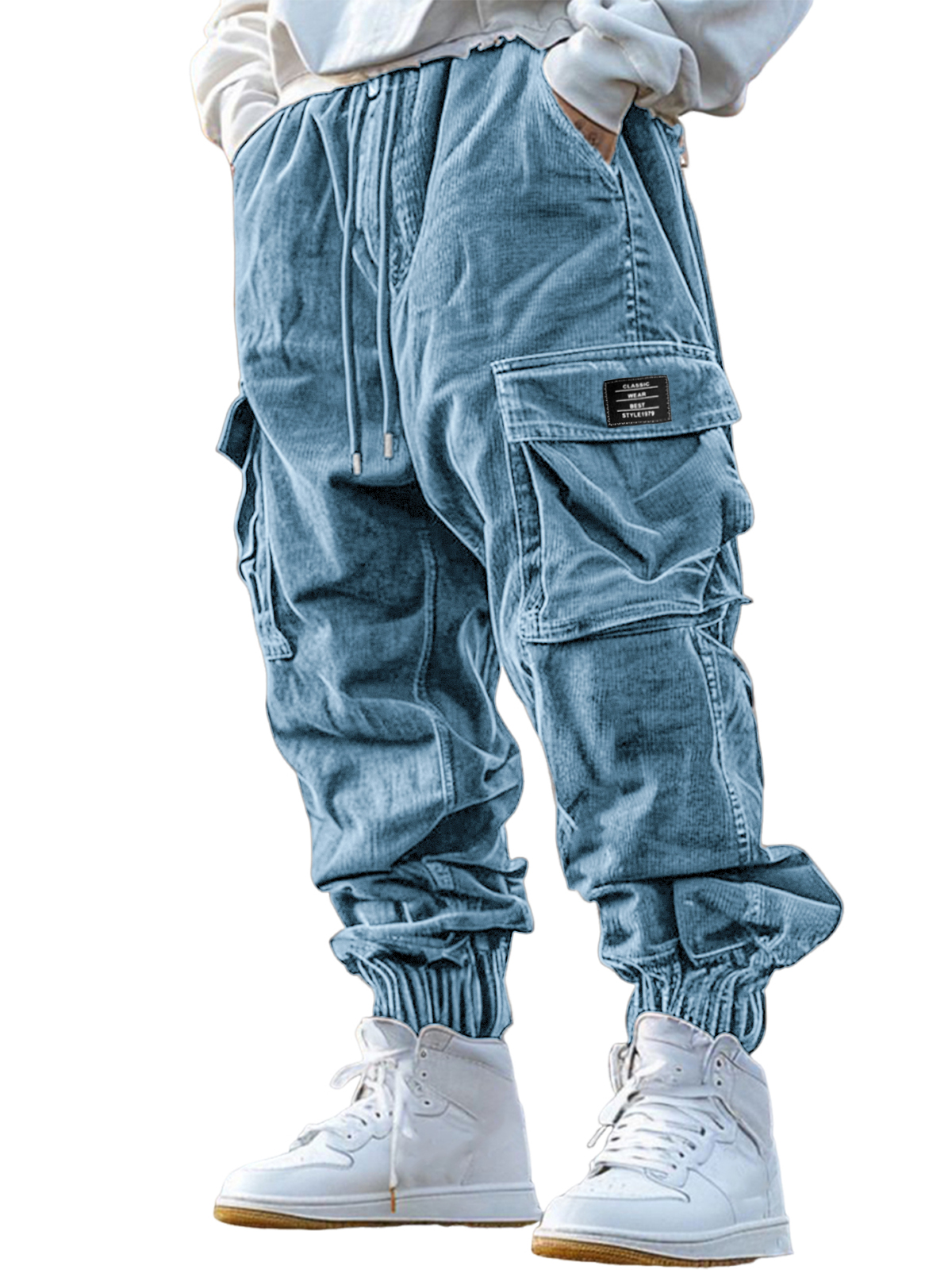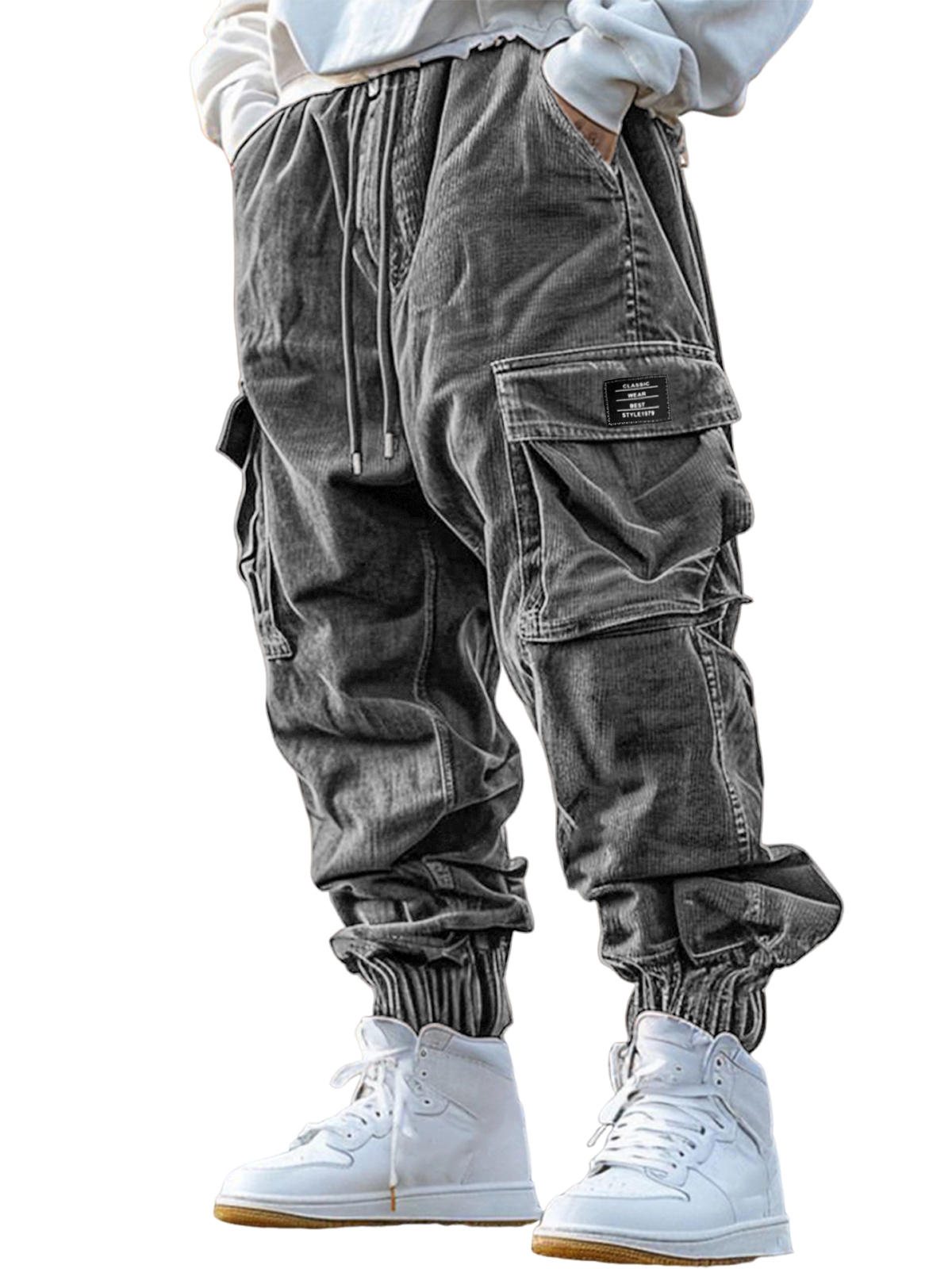 Men's Stylish Vintage Corduroy Multi-pocket Drawstring Casual Pants with Embroidered Label