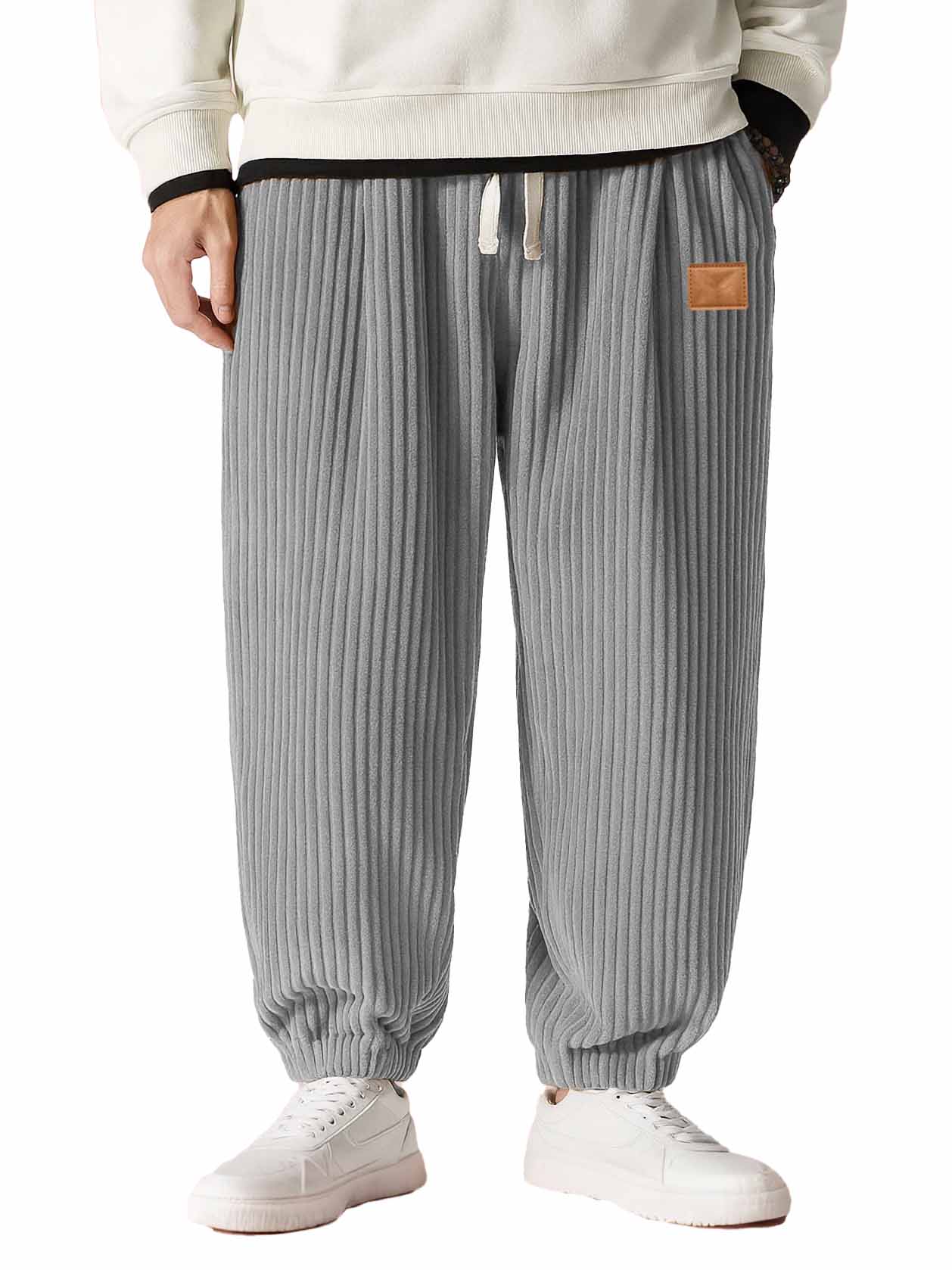 Men's Fashion Casual Thick Corduroy Fabric Leather Patch Embroidered Drawstring Loose Pocket Trousers