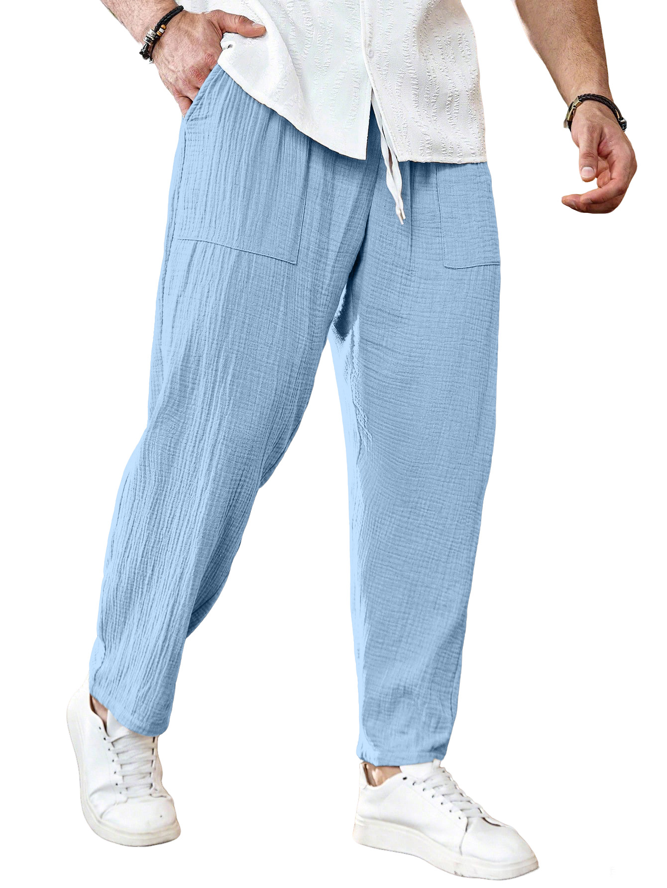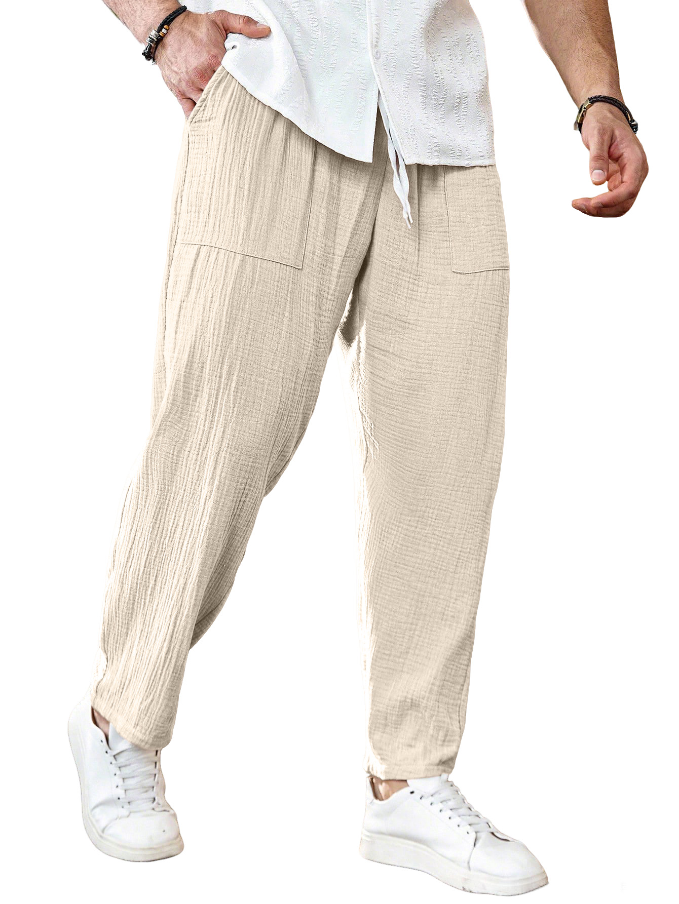 Men's Breathable Slub Linen Casual Daily Stretch Drawstring Trousers with Embroidered Label