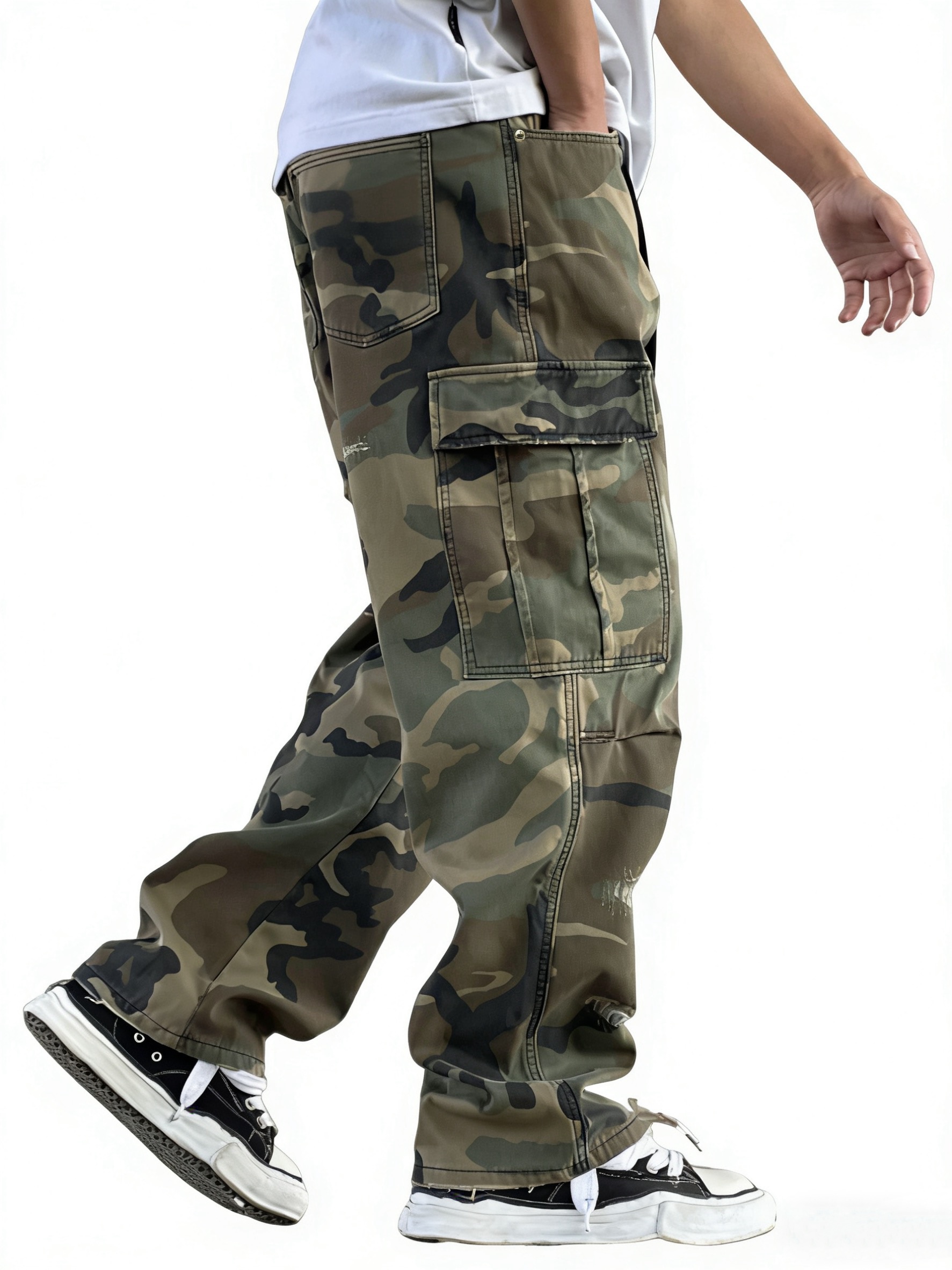Men's Vintage Workwear Irregular Camouflage Pattern Multi-pocket Wide-leg Trousers