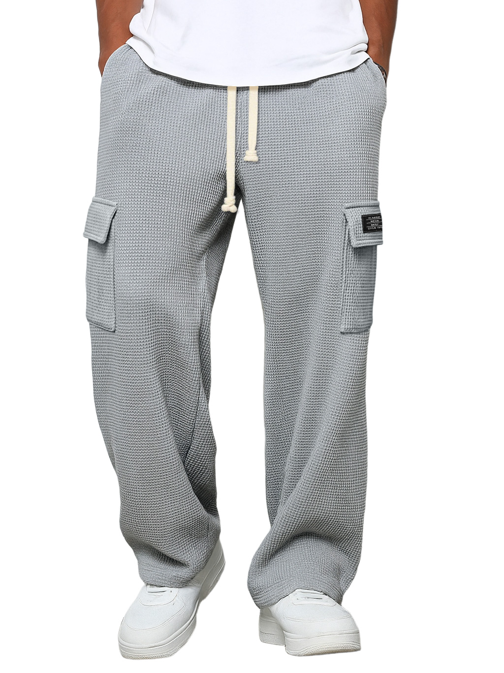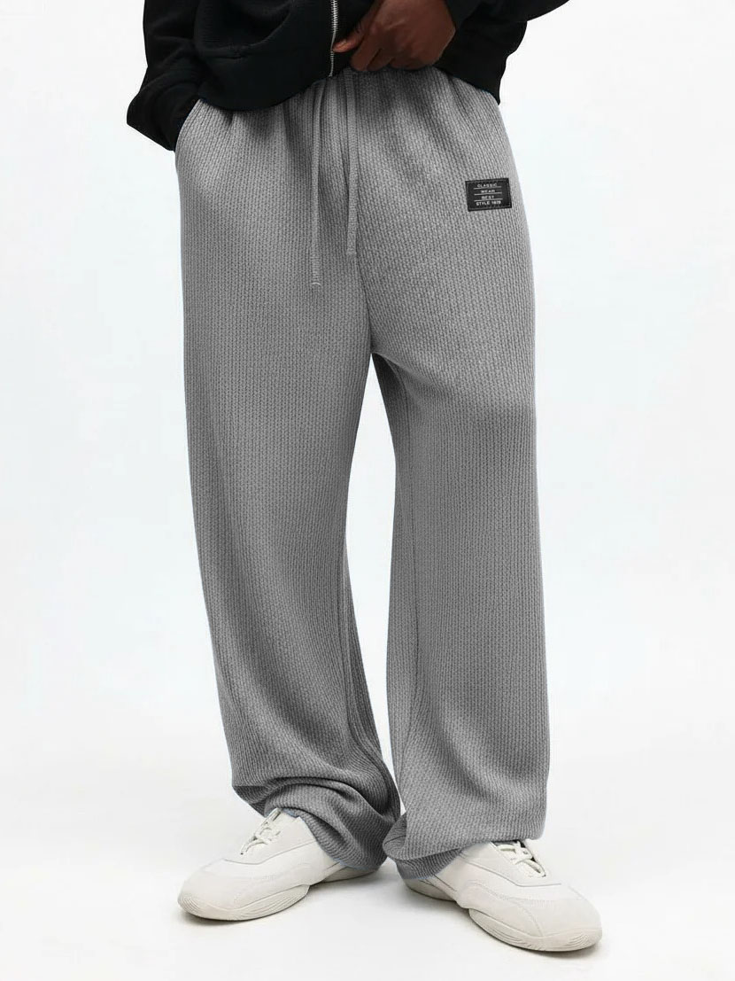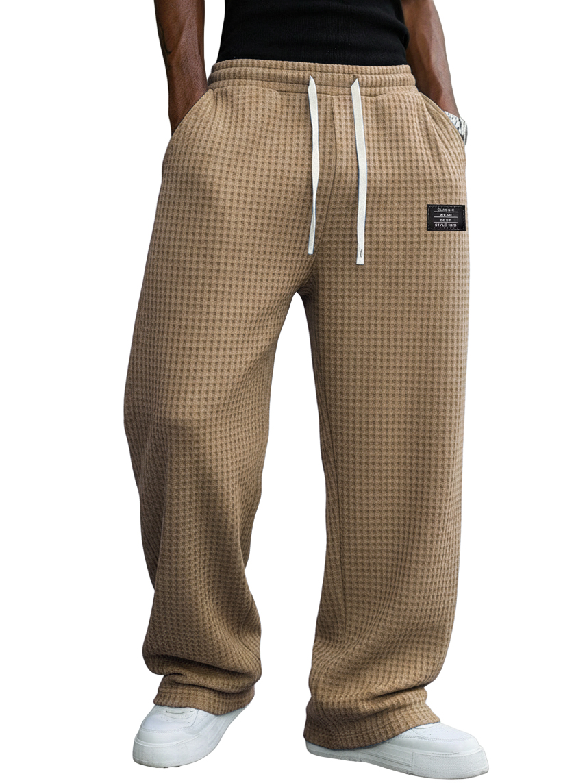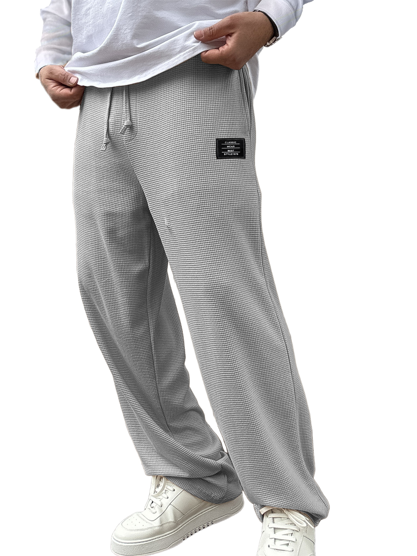 Men's Casual Solid Color Waffle Logo Loose Trousers