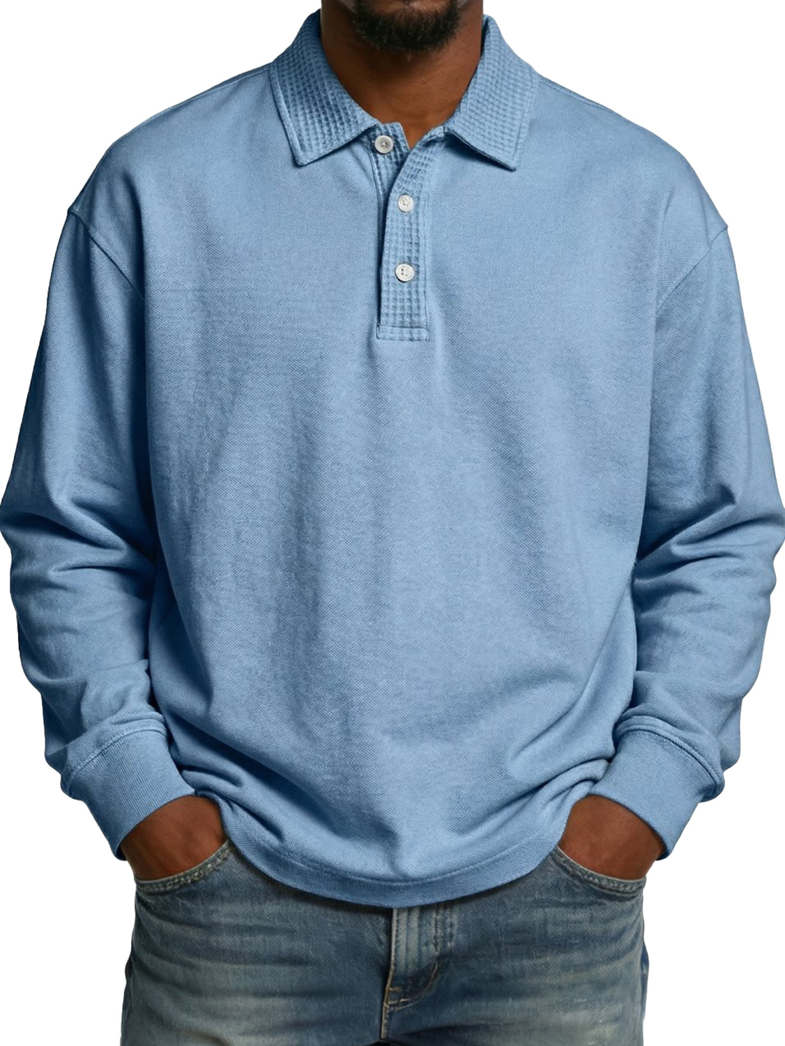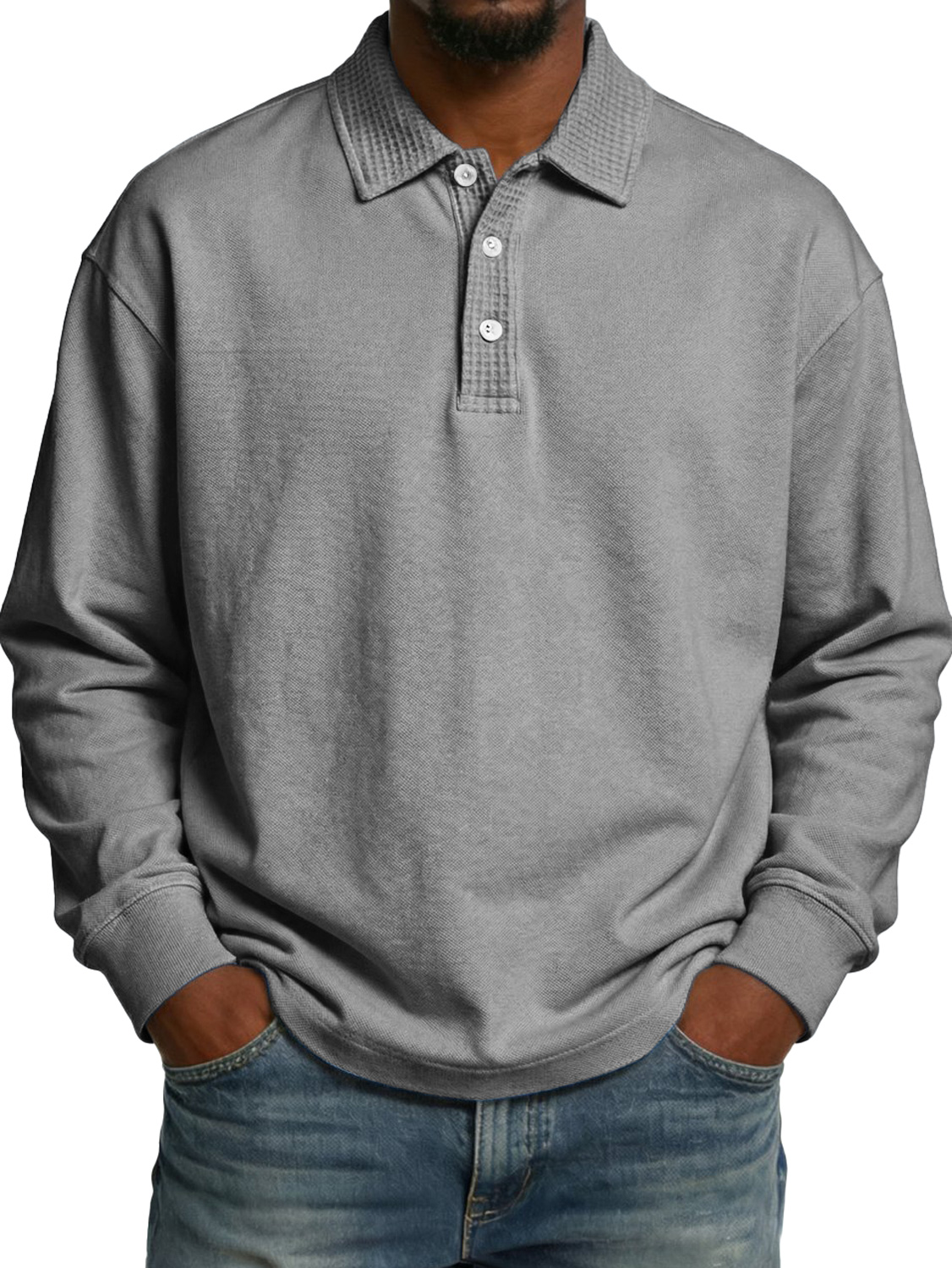 Men's Simple Ribbed Collar Button Casual Long-Sleeve Polo Shirt