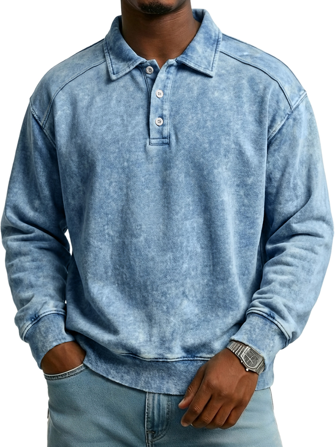 Men's Retro Washed Casual Polo Shirt with Turn-Down Collar and Buttons