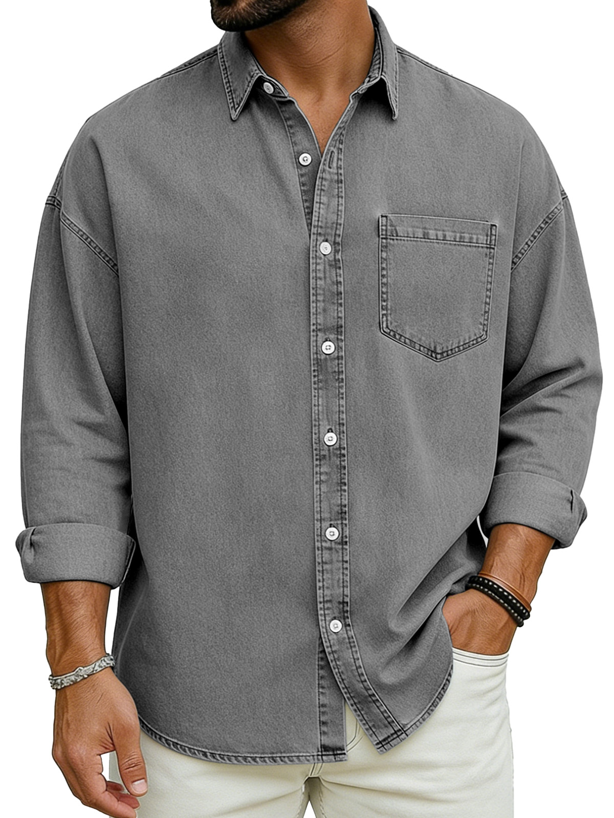 Men's Simple Loose Solid Color Versatile Button Lapel Long-sleeved Shirt