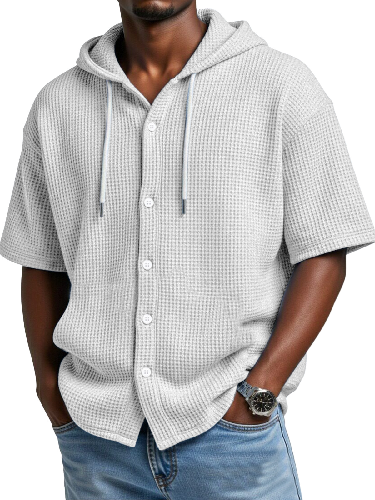 Men's Simple Waffle Knit Hooded Button-up Casual Short-sleeve Top