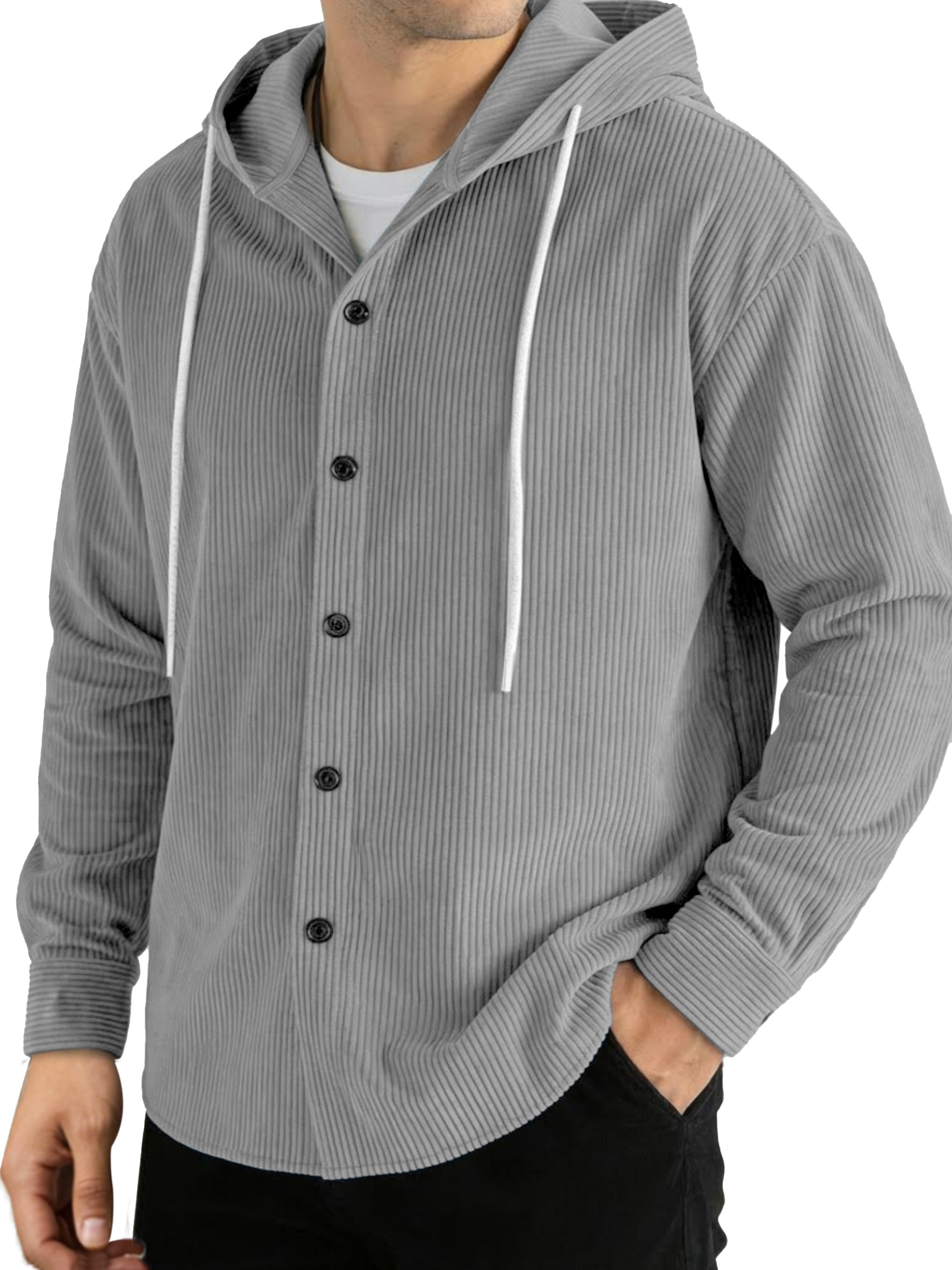 Casual Solid Color Vertical Ribbed Button-Up Hooded Long-Sleeve Shirt