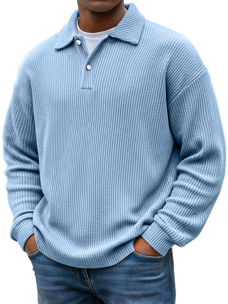Men's Daily Casual Ribbed Lapel Button-down Loose Long-sleeved Polo Shirt