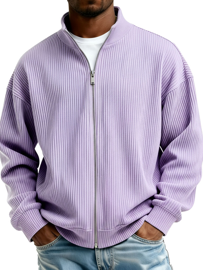Men's Simple Ribbed Textured Stand Collar Zipper Loose Jacket