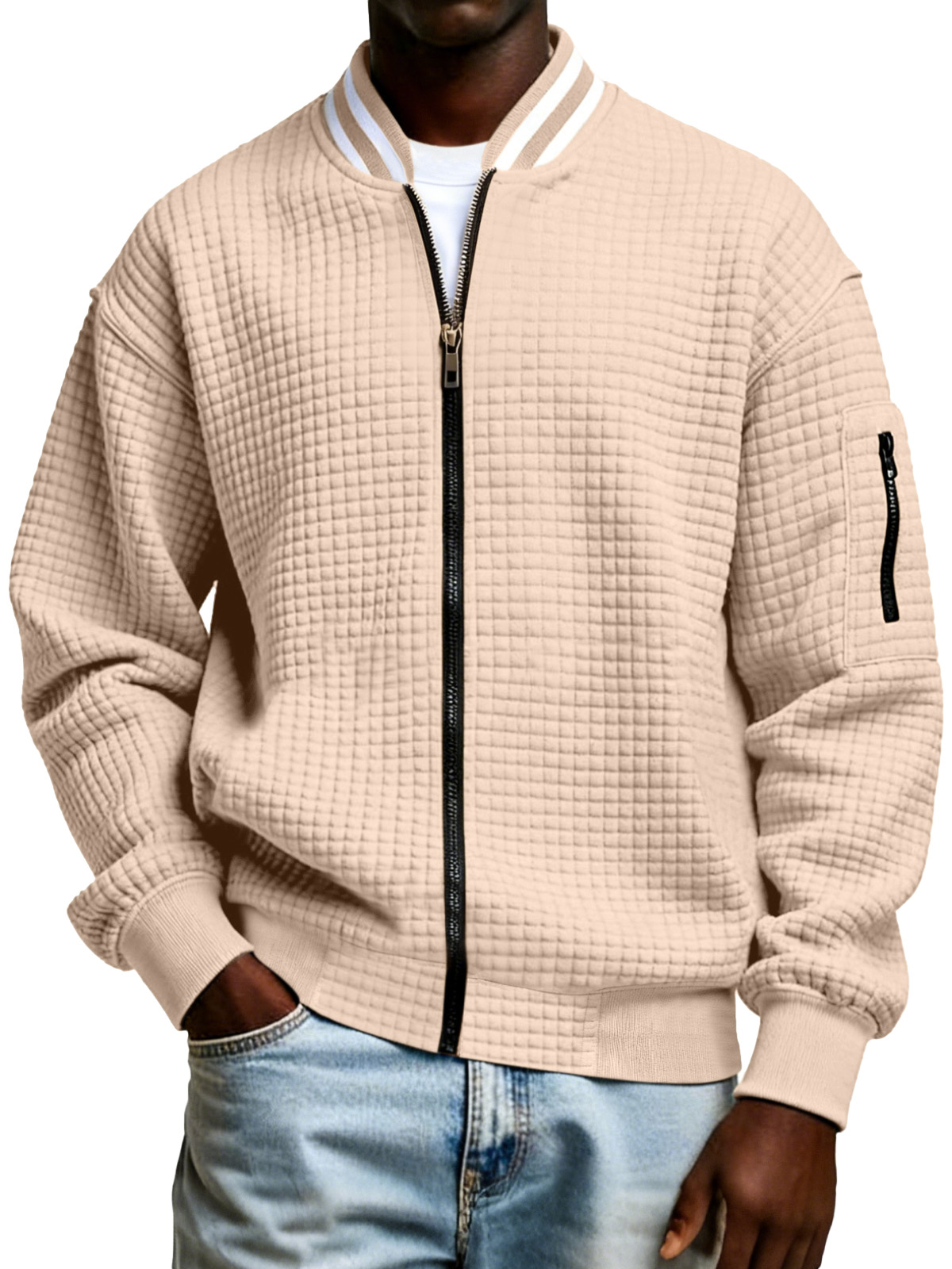 Men's Simple Stand Collar Waffle Casual Zip-Up Jacket