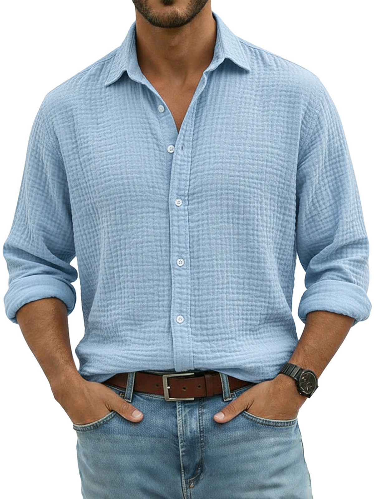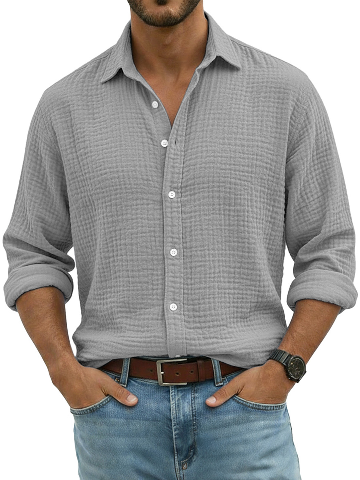 Men's Comfortable Solid Color Crinkled Breathable Long-sleeved Shirt
