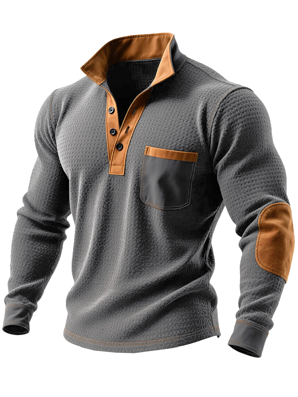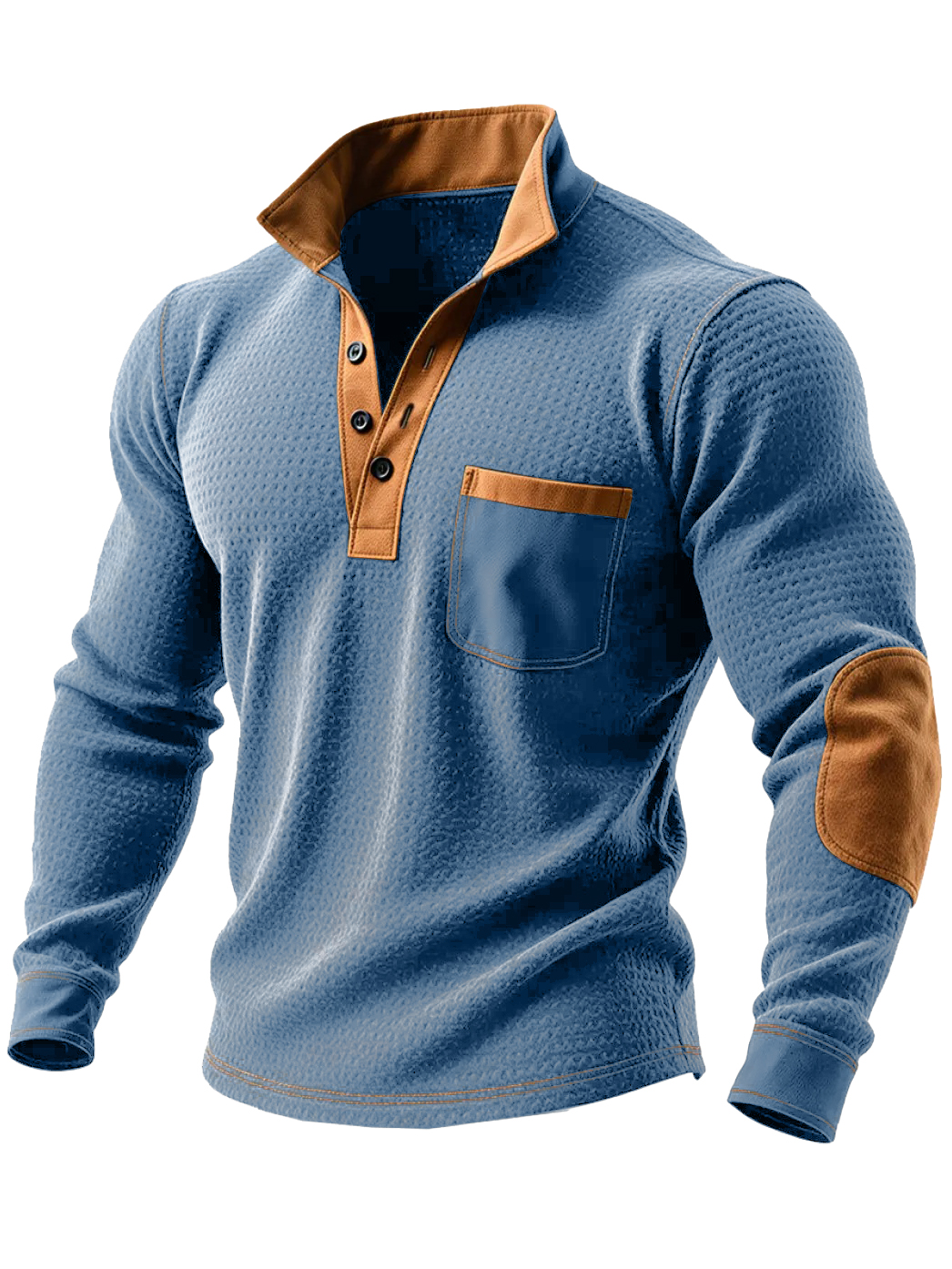 Men's Fashionable Casual Patchwork Stand Collar Long-Sleeved Henley Shirt