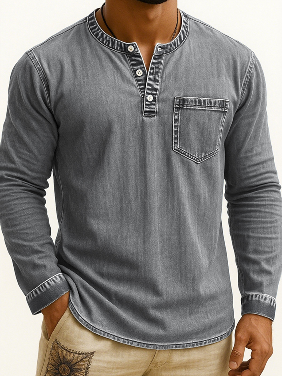 Men's Vintage-style Long-sleeve Henley Shirt with Pockets