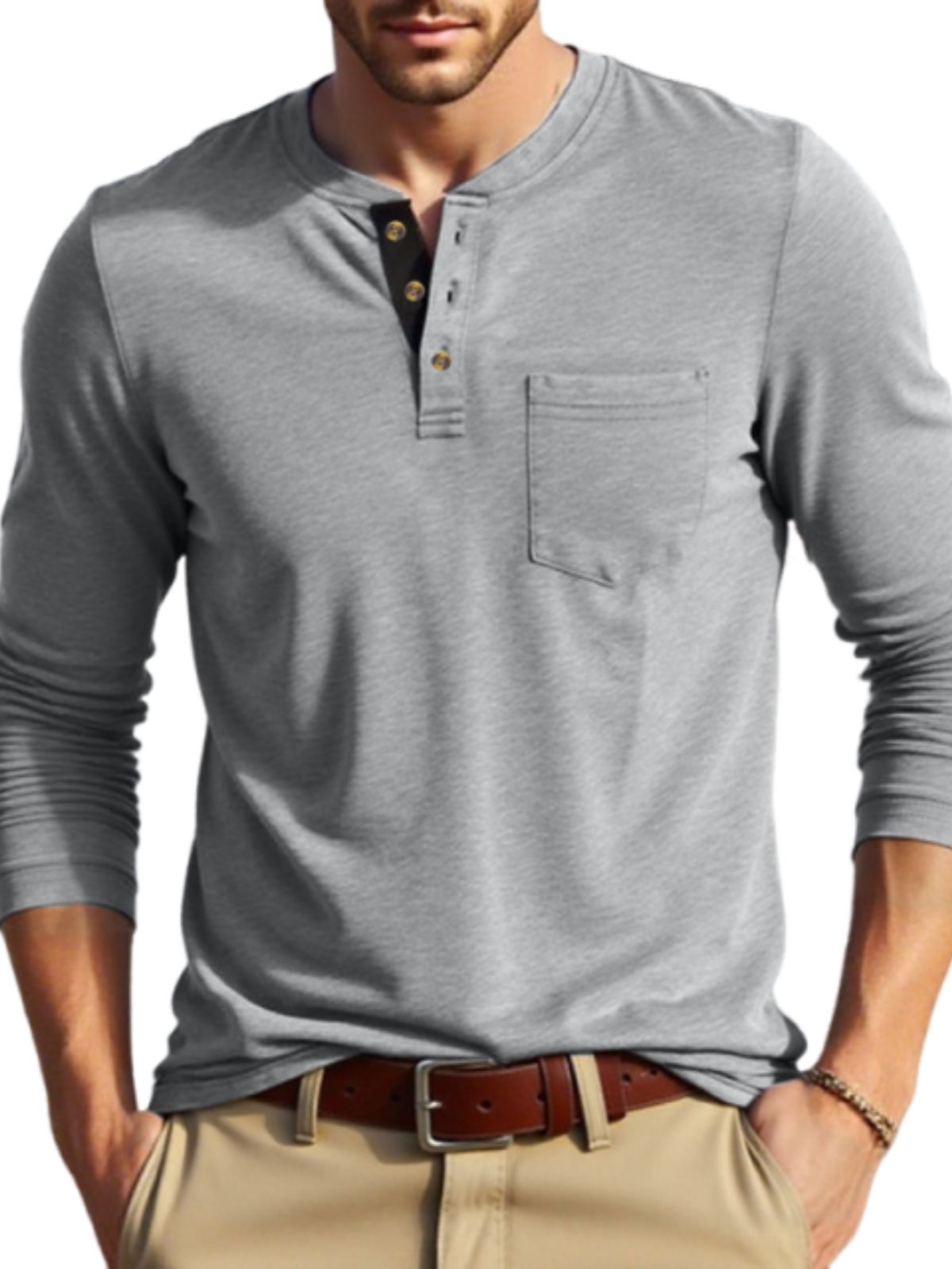 Men's Fashionable Everyday Ribbed Pocket Casual Long Sleeve Henley Shirt