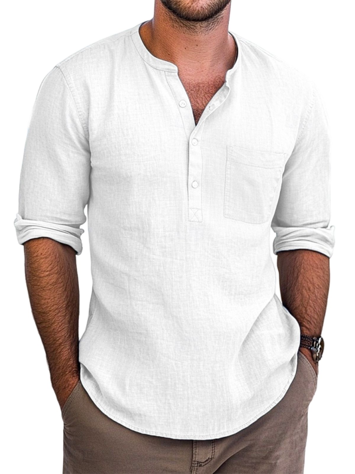 Men's Casual Fashion Basic Casual Henley Collar Cotton And Linen Long-sleeved Top