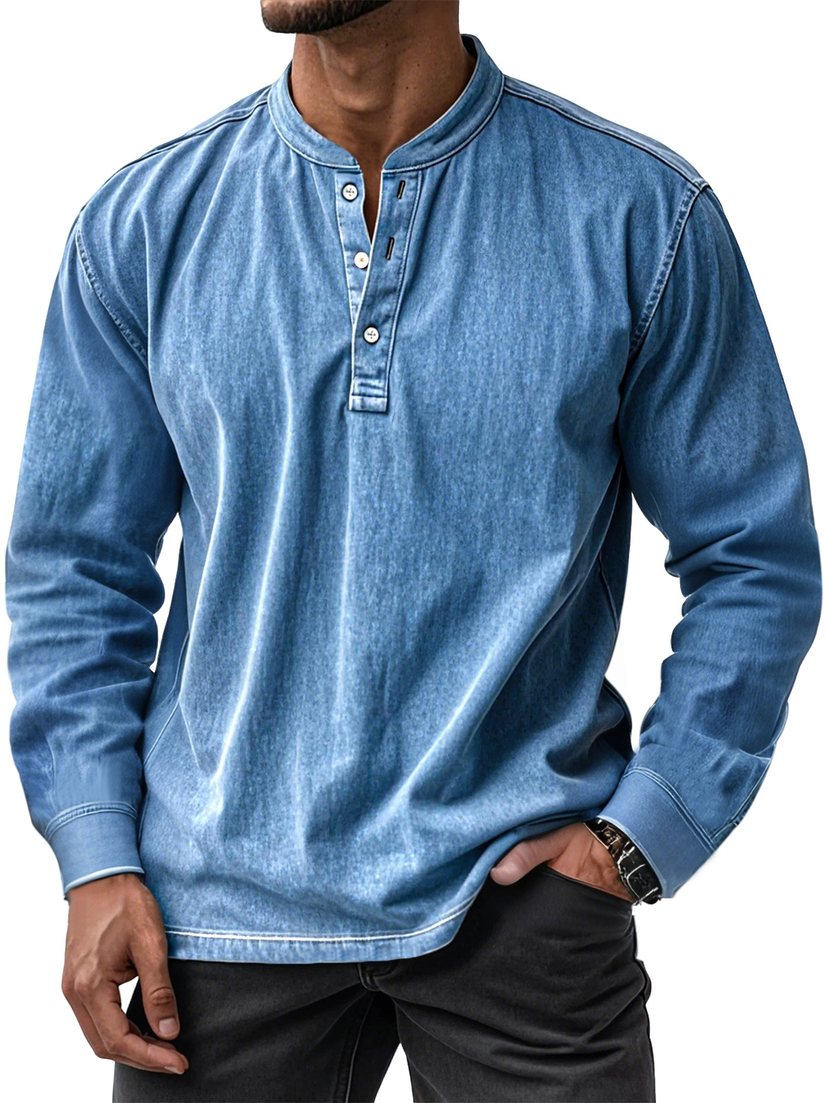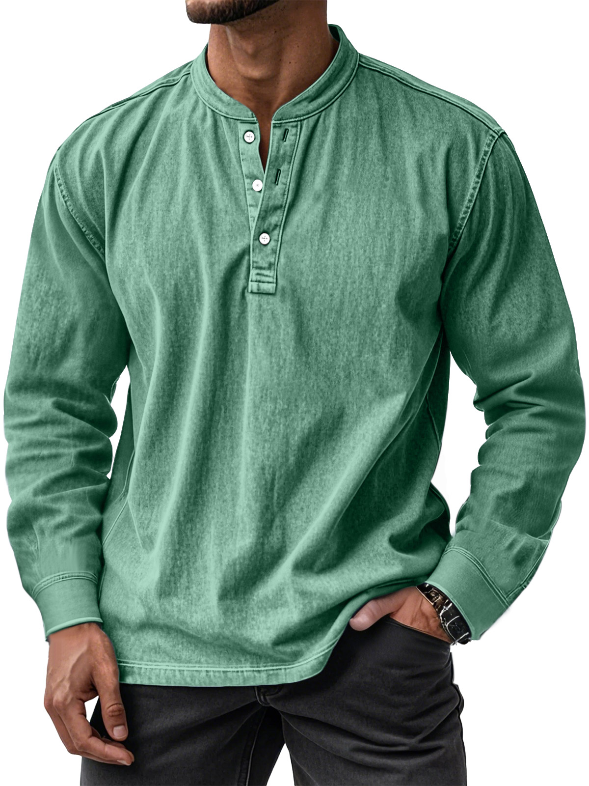 Men's Retro Casual Stand Collar Button-Down Long Sleeve Henley Shirt