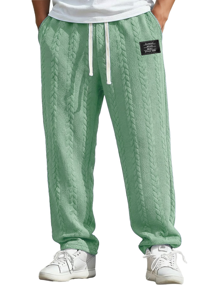 Men's solid color jacquard textured casual trousers with elastic waistband and embroidered logo.