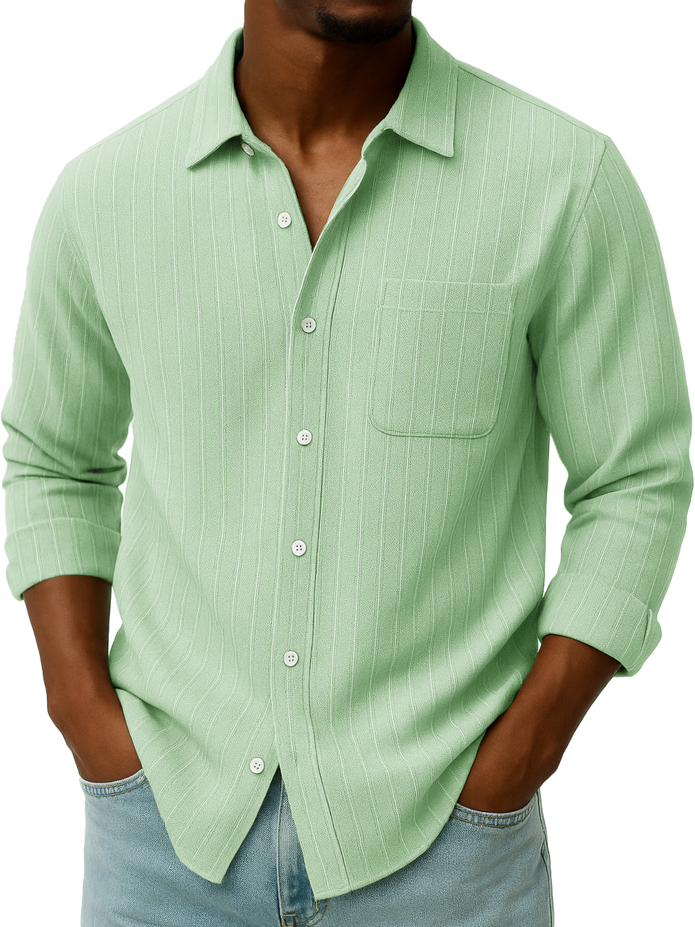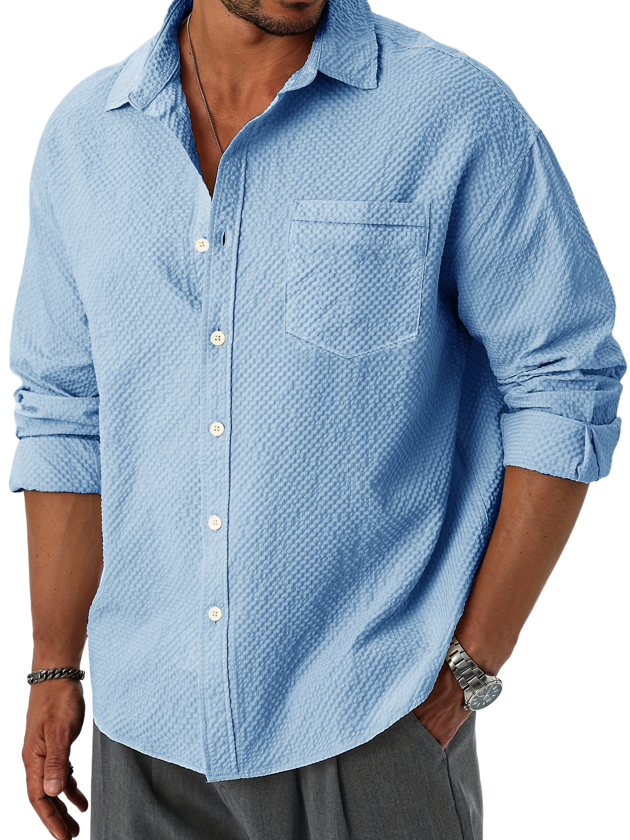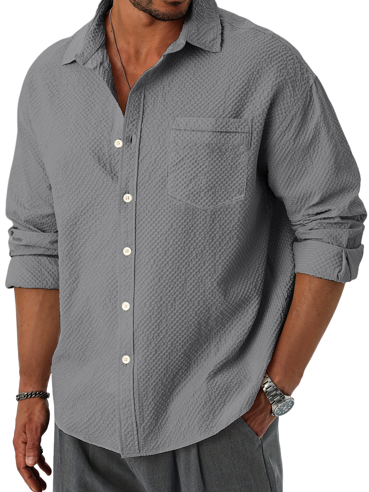 Men's Casual And Comfortable Solid Color Jacquard Pocket Long Sleeved Shirt