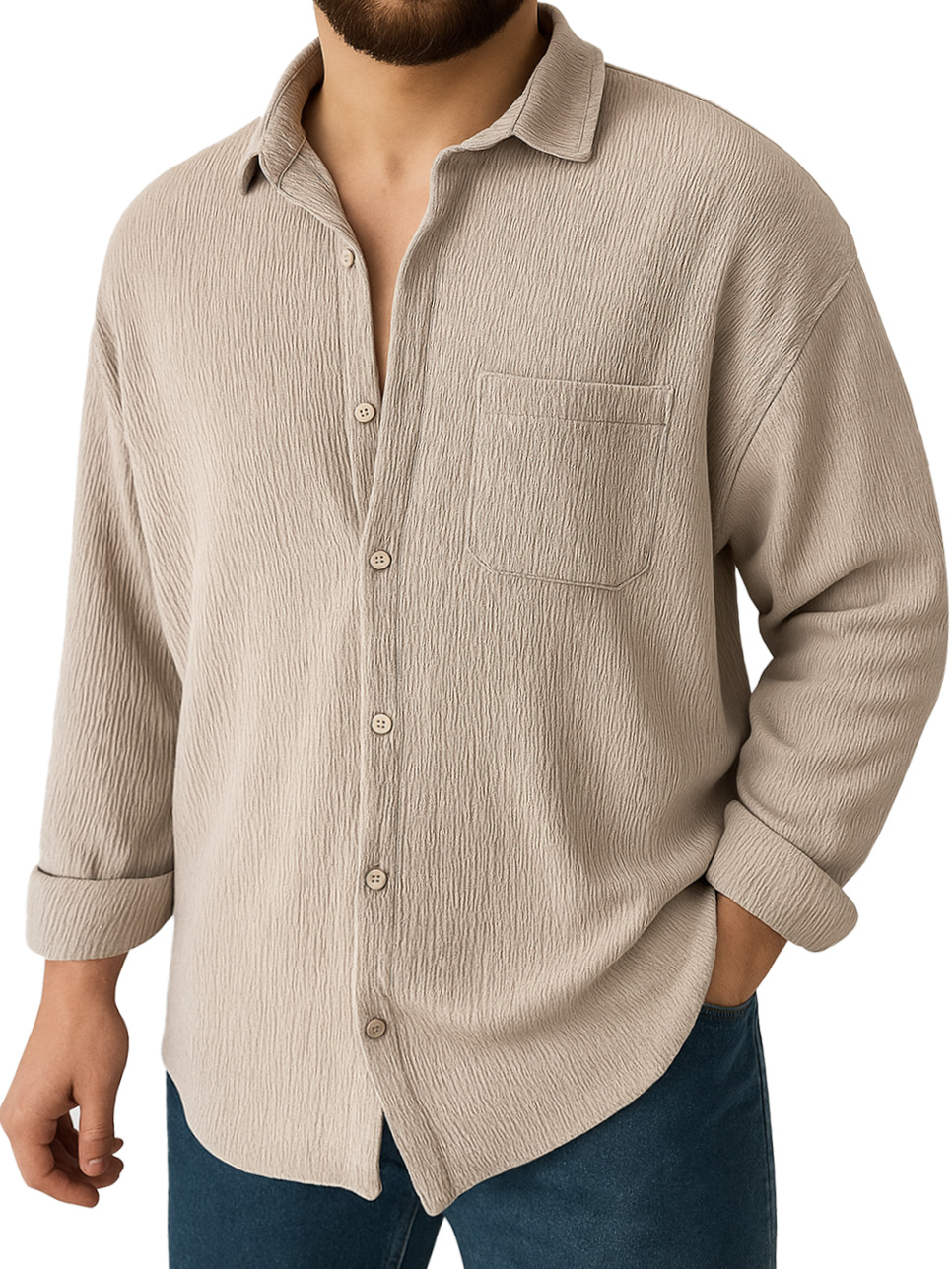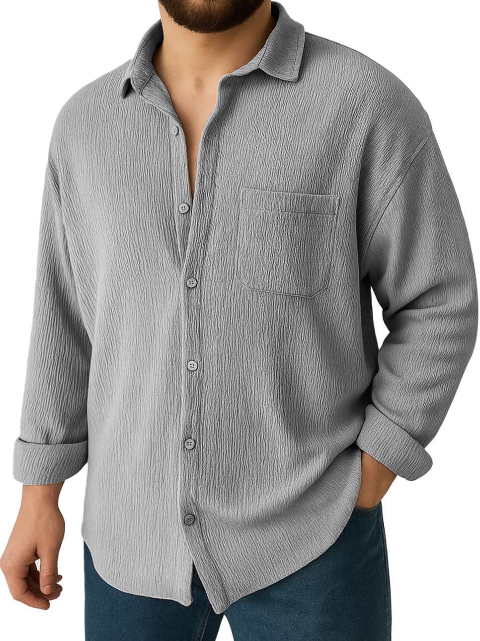 Men's Clothing Fashionable Daily Jacquard Texture Fabric Loose Pockets Long-sleeved Lapel Shirt