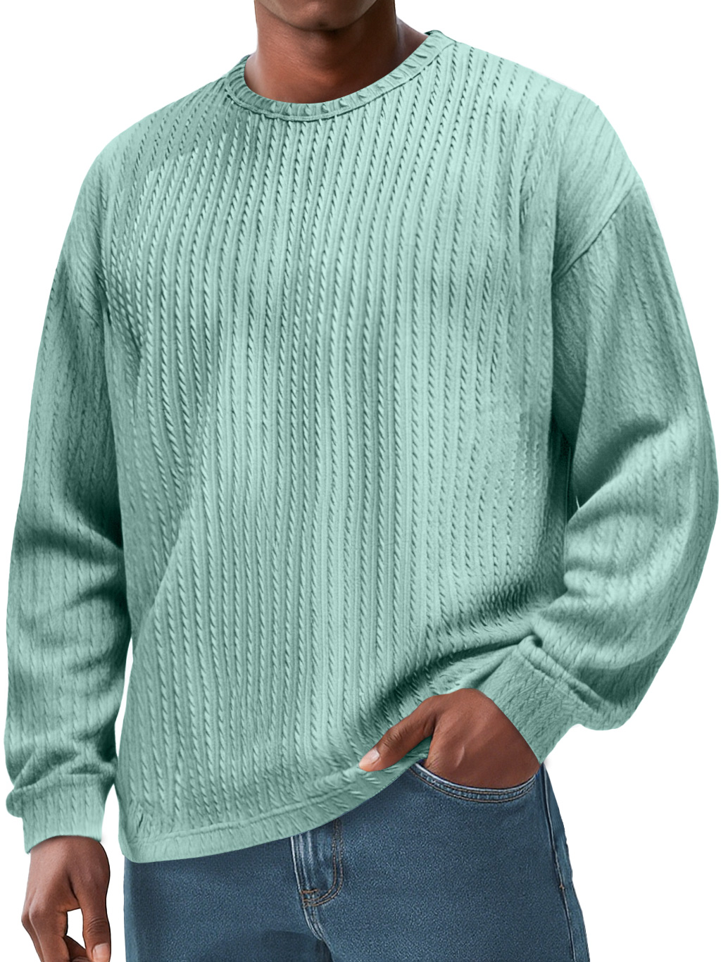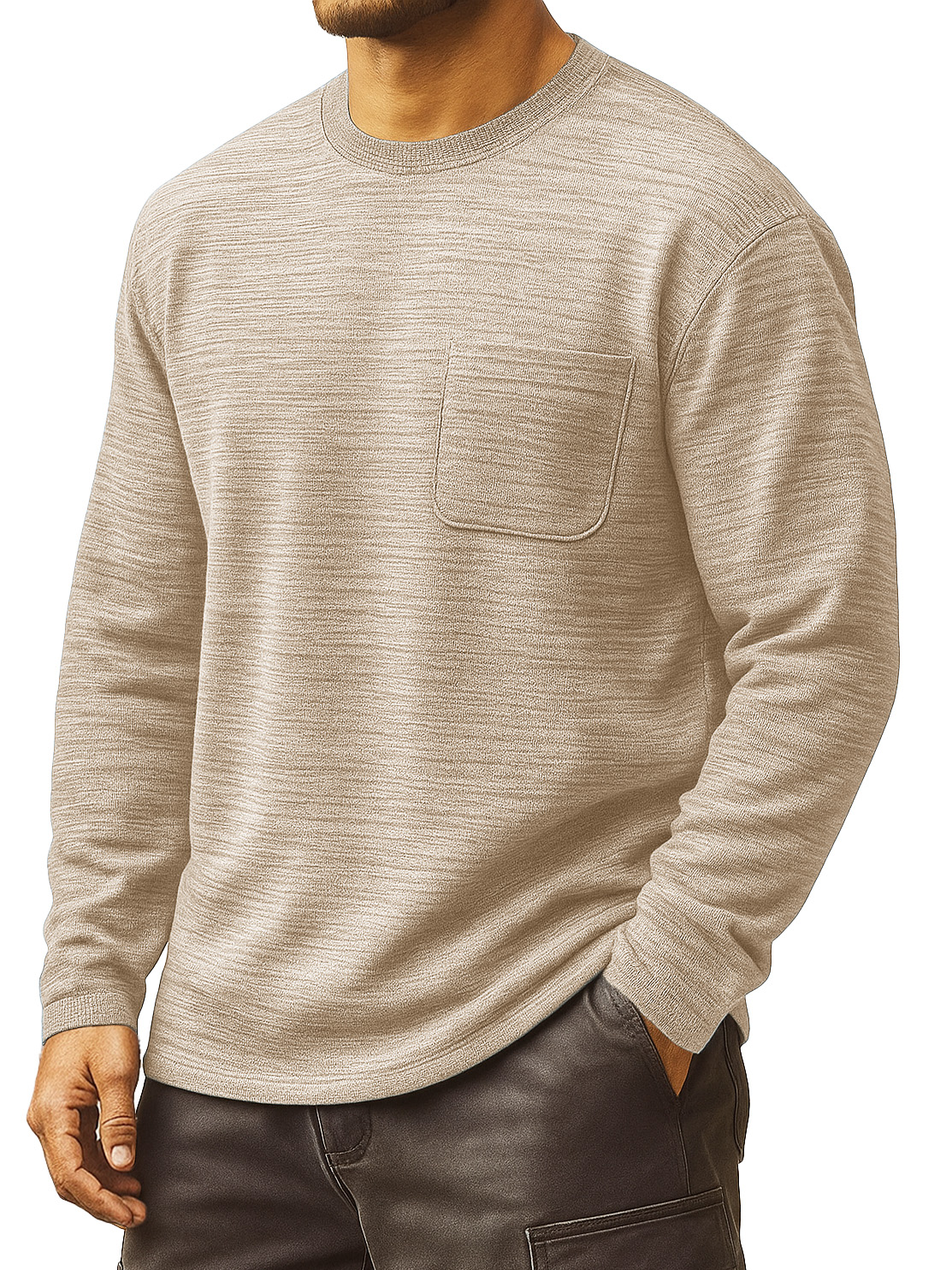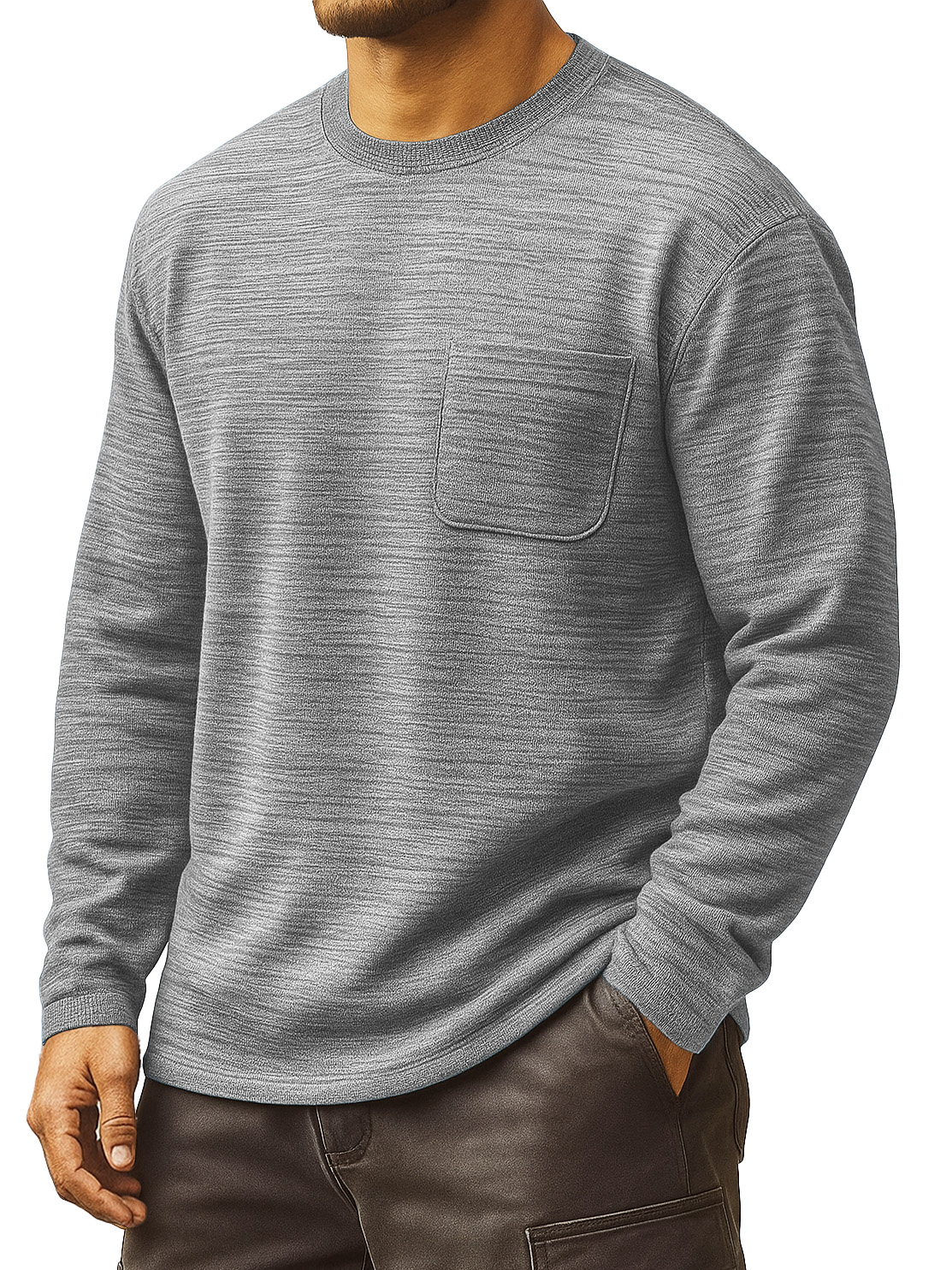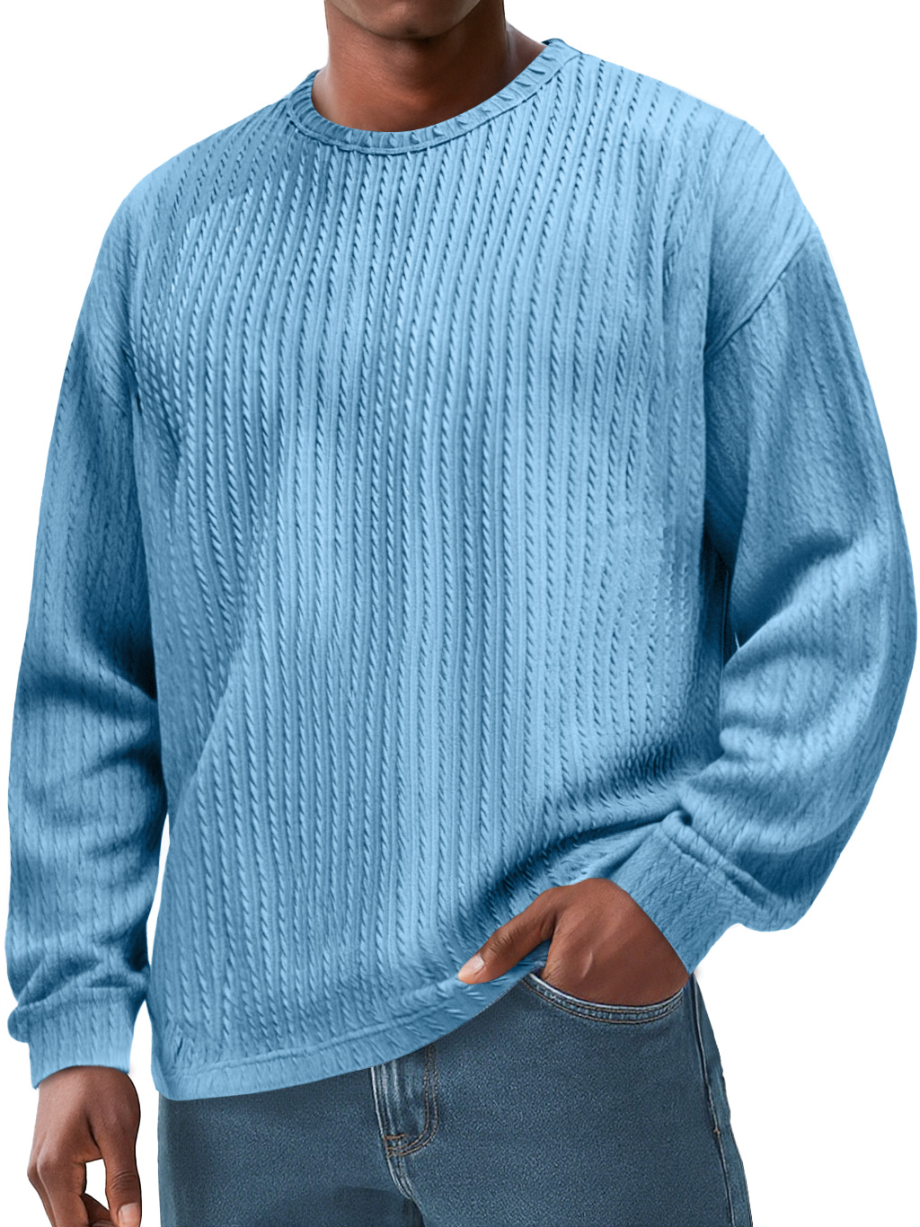 Men's Clothing Fashionable Daily Jacquard Texture Fabric Loose Pockets Long-sleeved Round-collar T-shirt