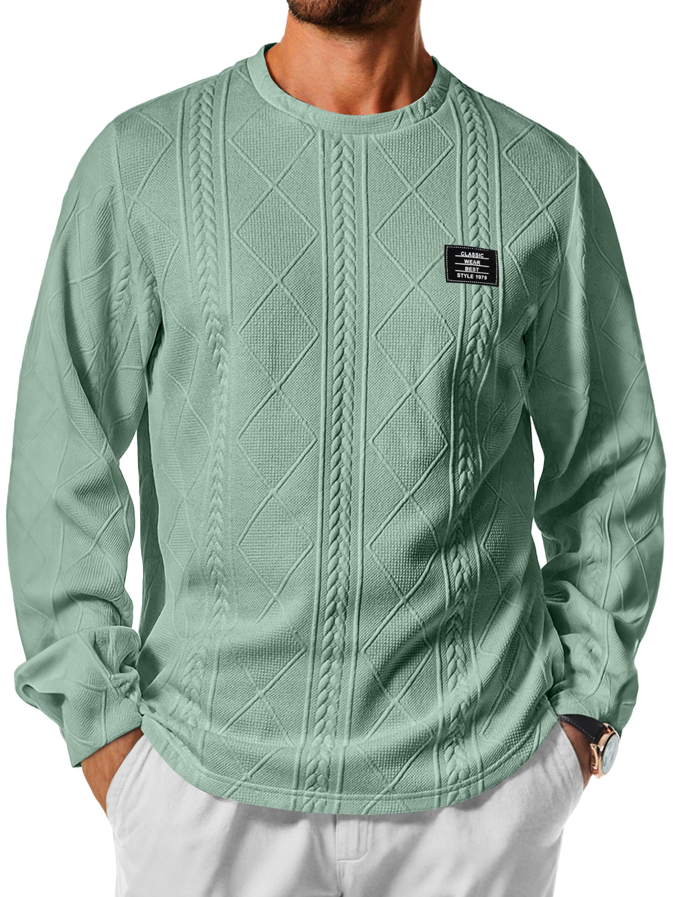 Men's Daily Round Neck Jacquard Texture Embroidered Logo Casual Long-sleeved T-shirt