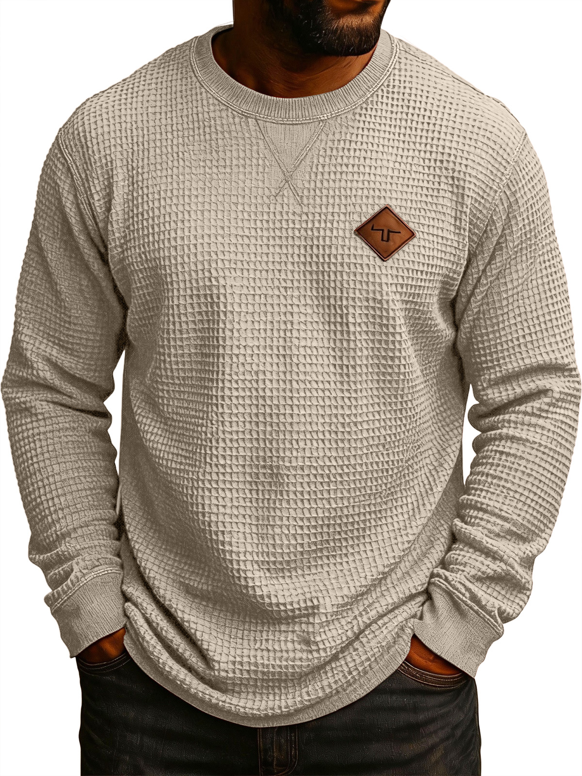 Men's Vintage Workwear Waffle Knit Embroidered Logo Crew Neck Long-Sleeve T-Shirt