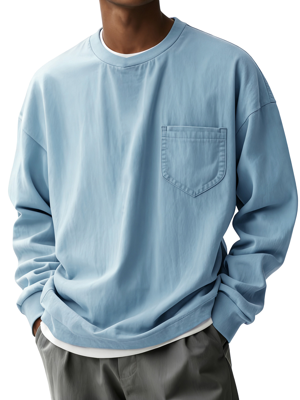 Men's Fashion Casual Pleated Fabric Round-neck Pocket Long-sleeve Top