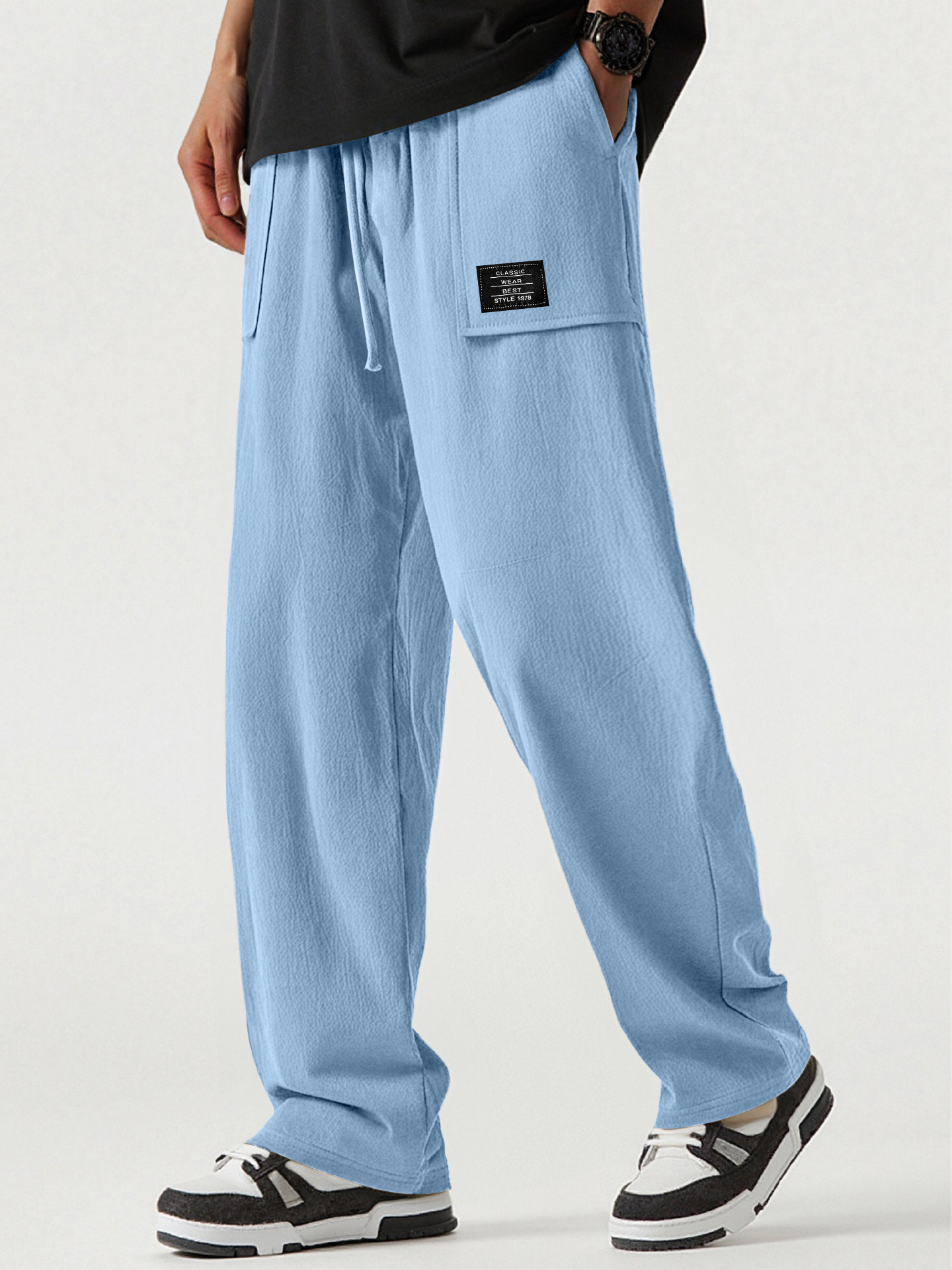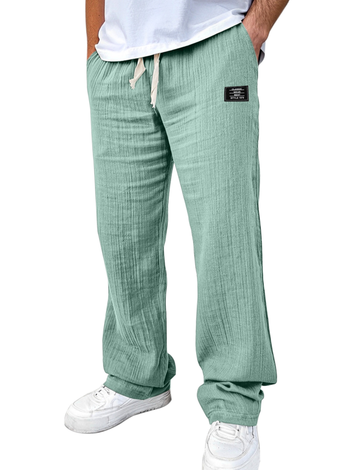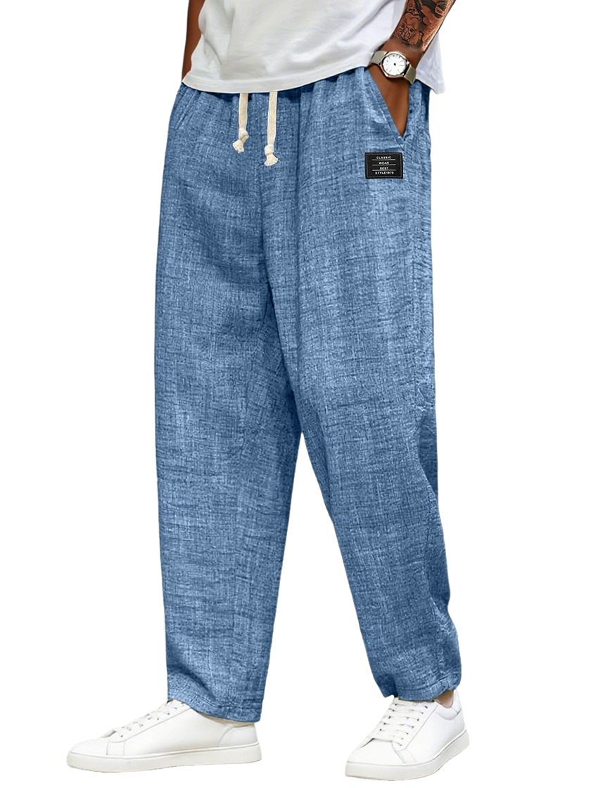 Men's Breathable Slub Linen Casual Daily Stretch Drawstring Trousers with Embroidered Label