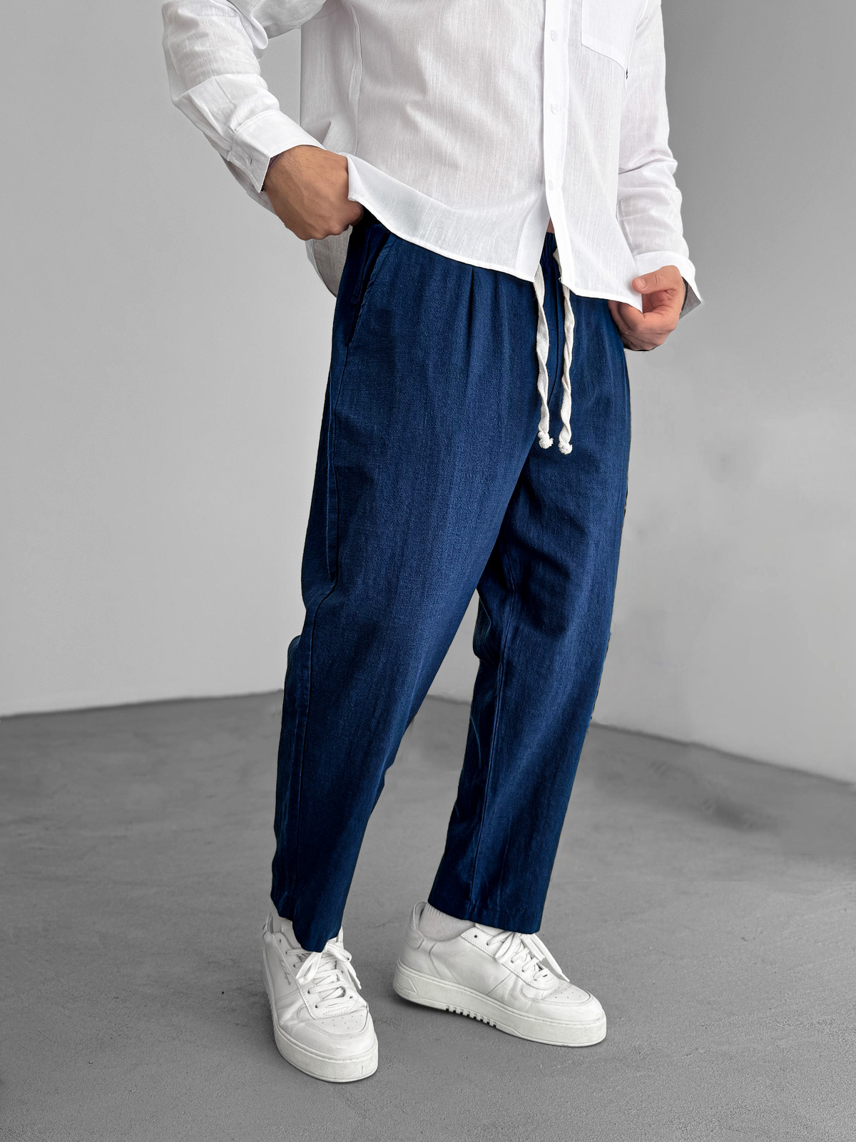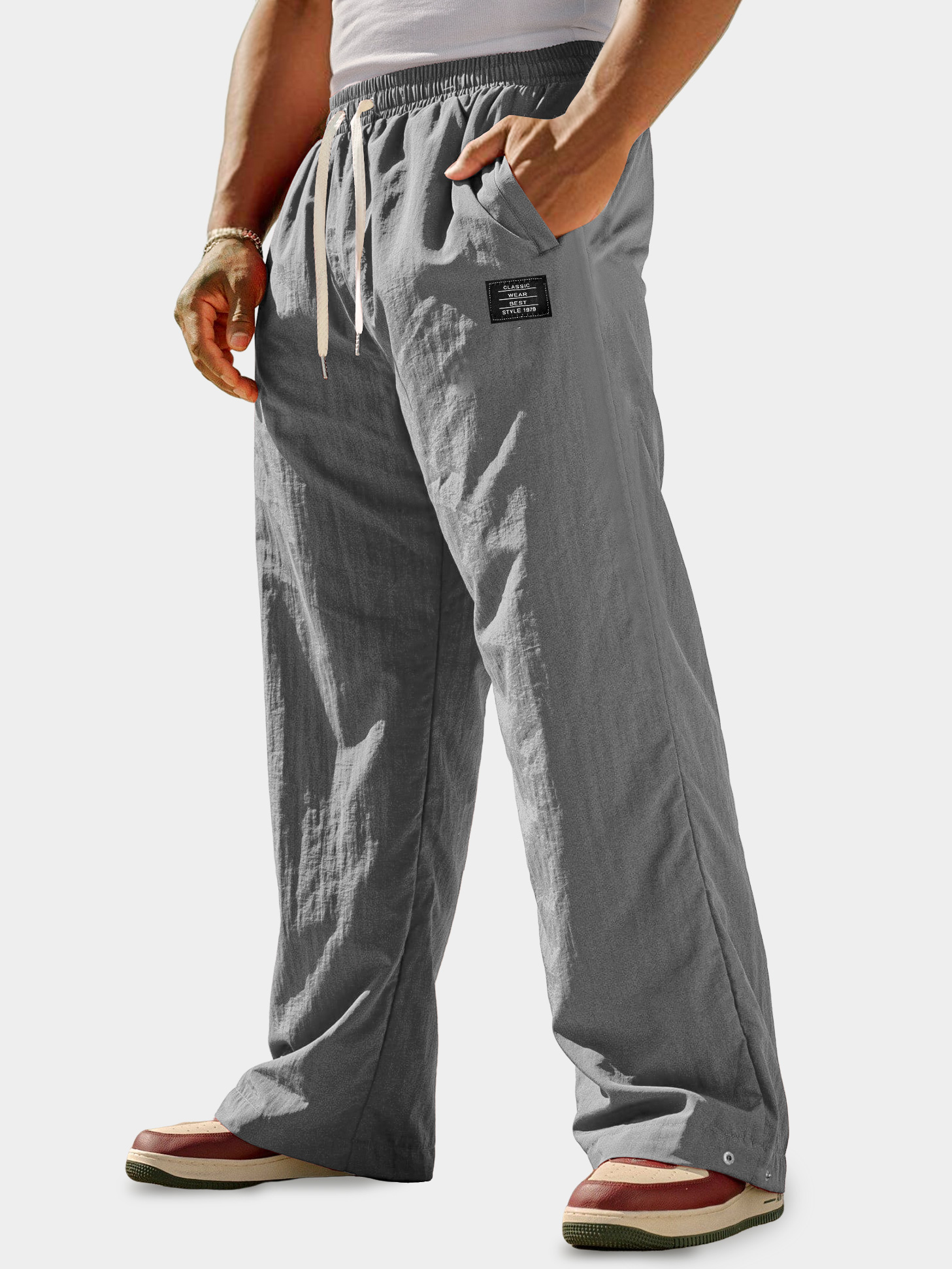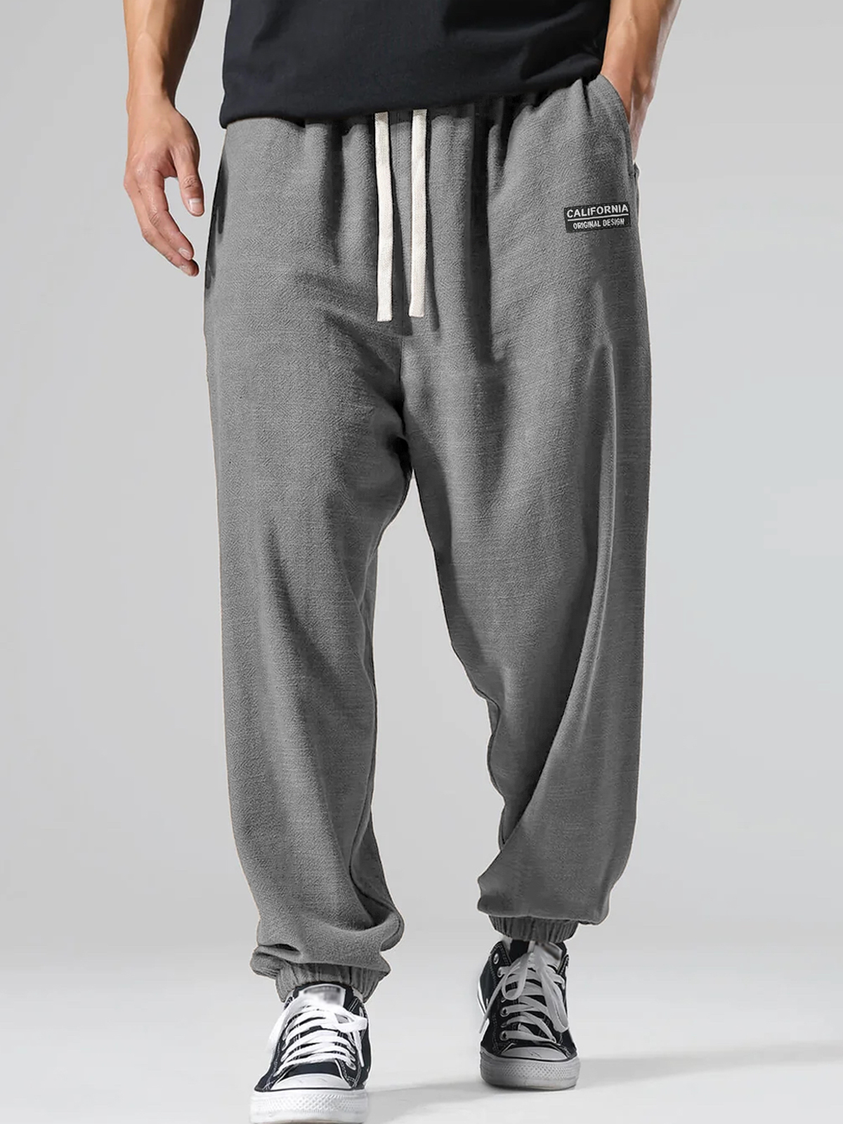 Men's Breathable Slub Linen Casual Daily Stretch Drawstring Trousers with Embroidered Label