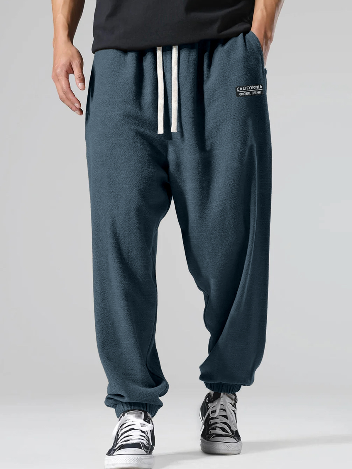 Men's Fashion Casual Waffle Fabric Pocket Pocket Embroidery Drawstring Loose Trousers