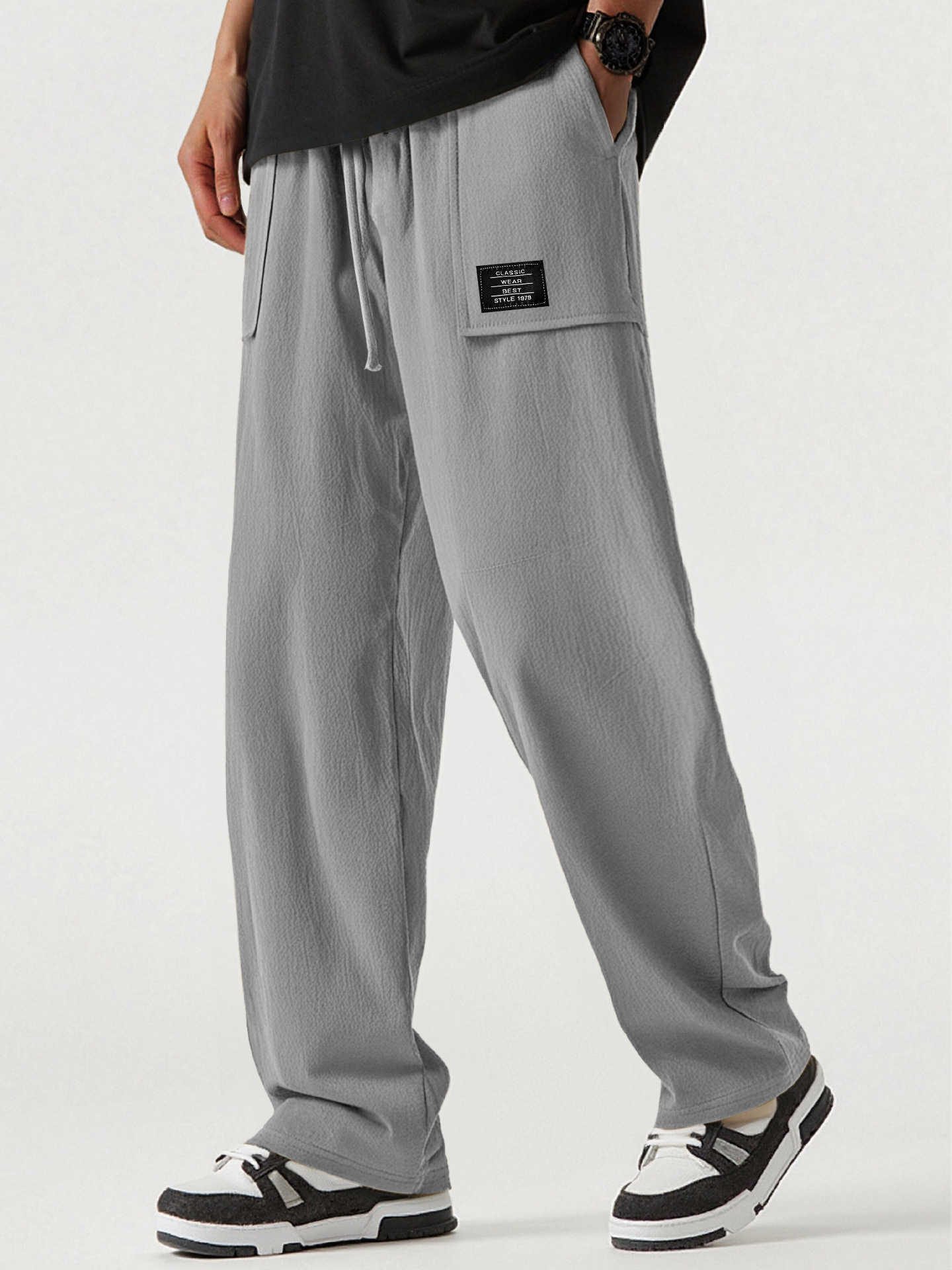 Men's Fashion Casual Everyday Hemp Fabric Pocket Embroidered Logo Loose Trousers