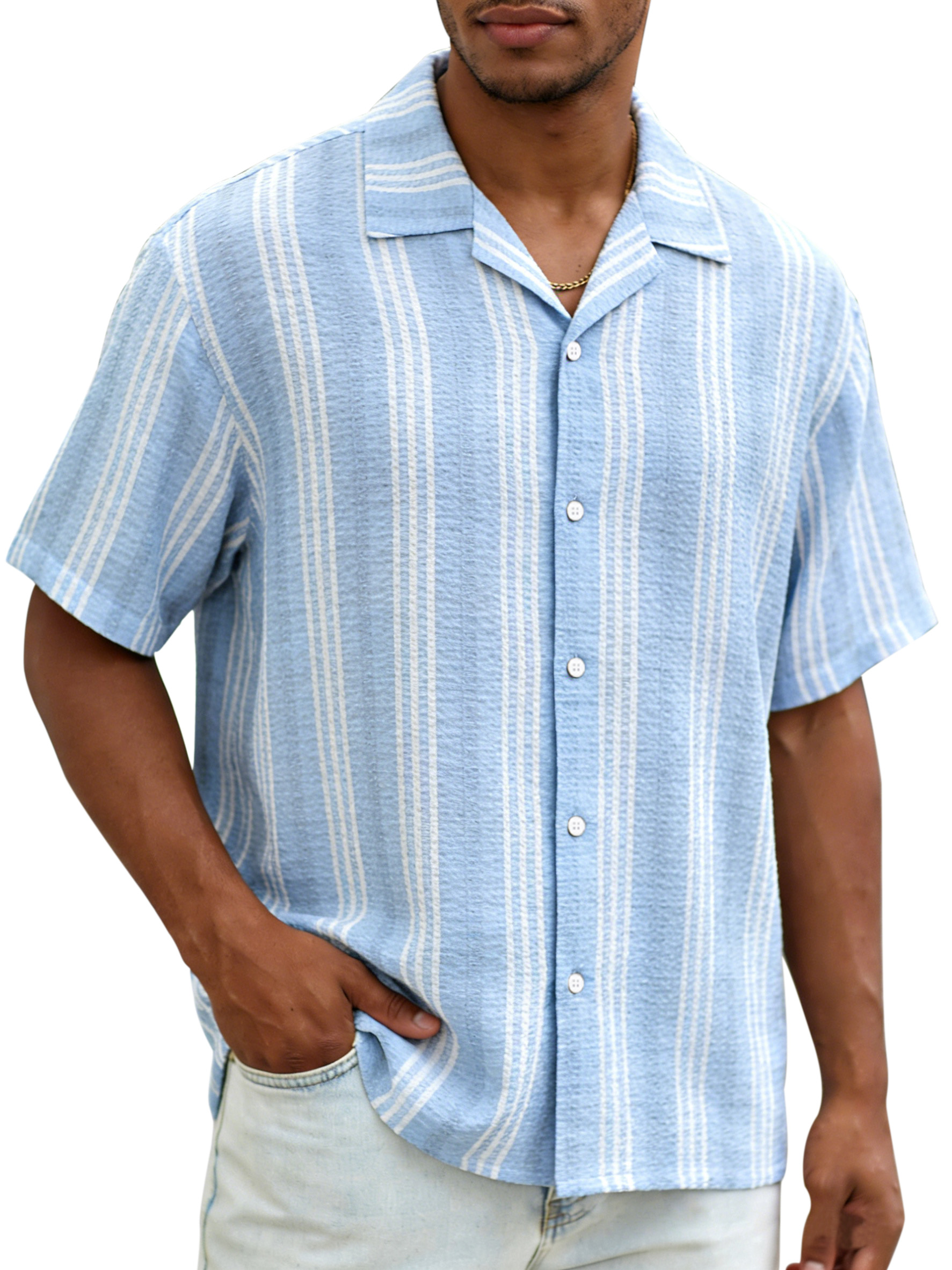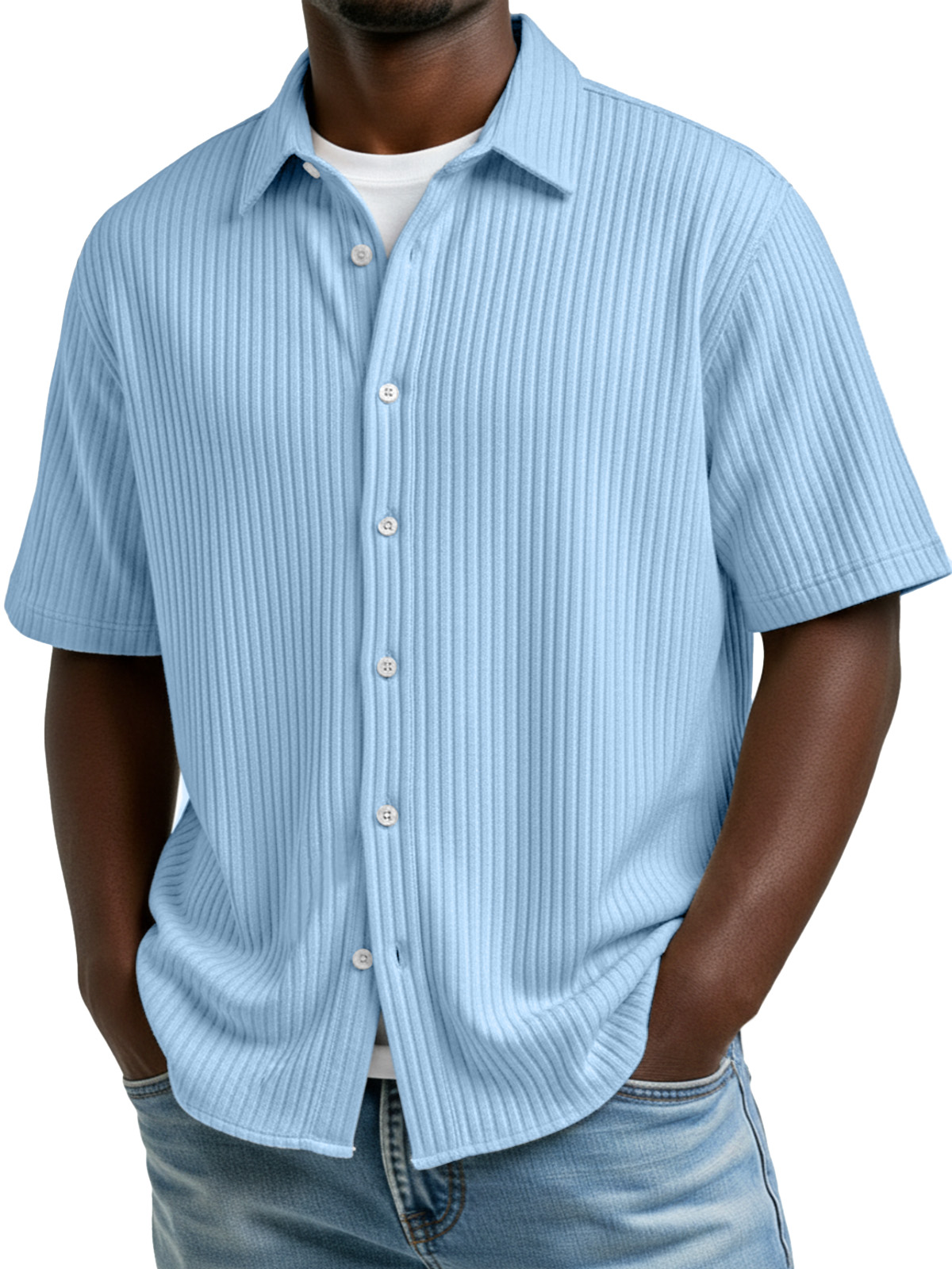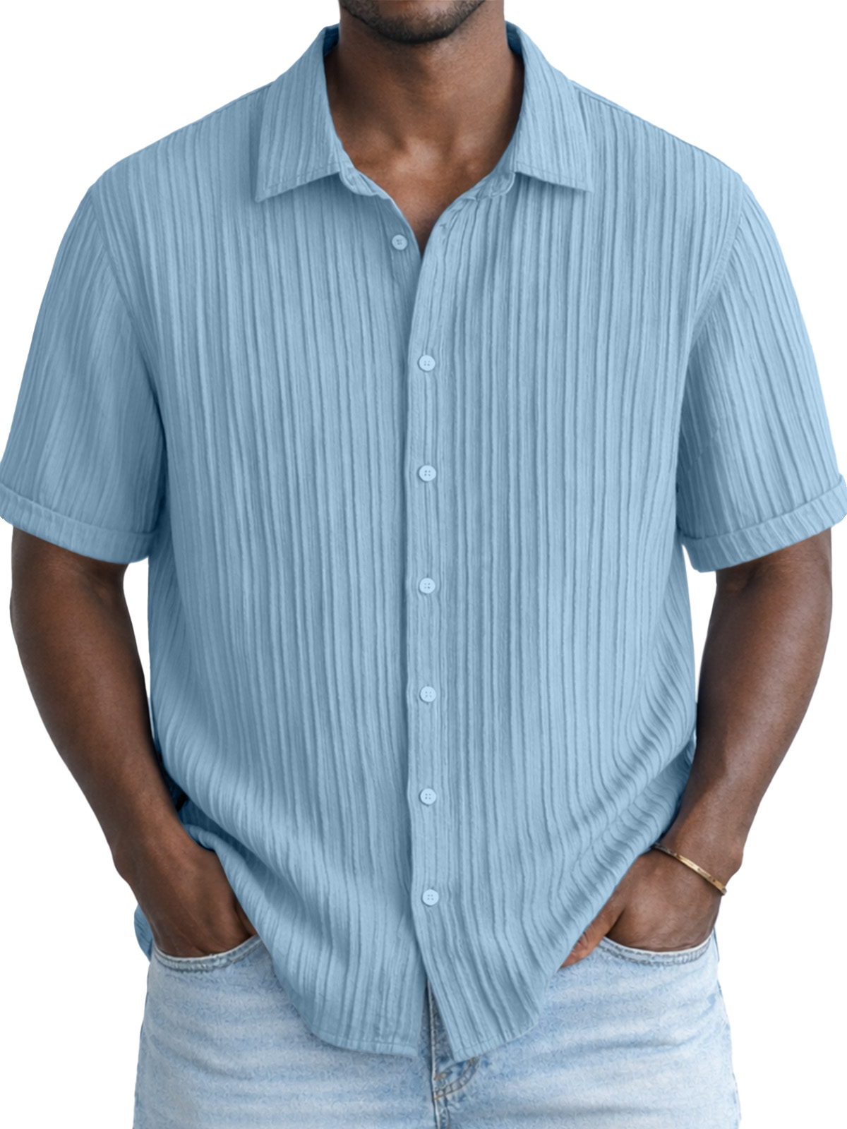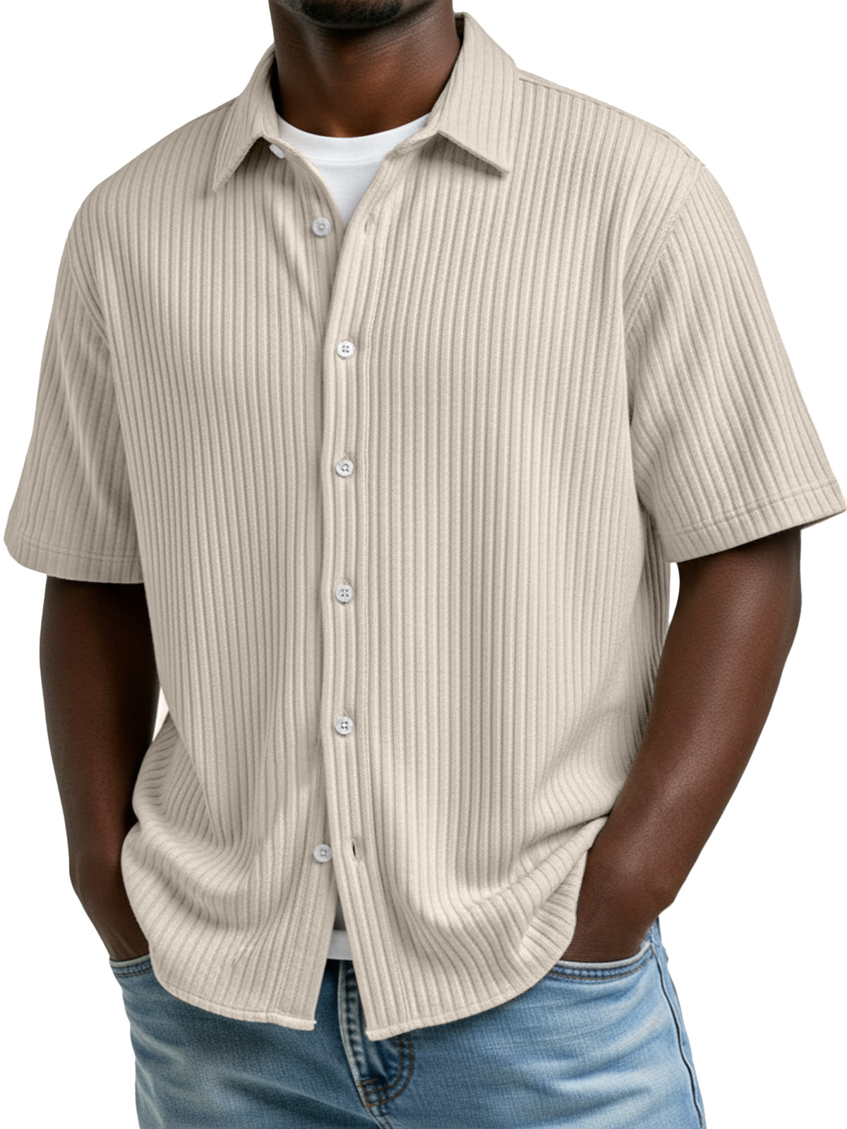Men's Simple Solid Color Vertical Stripe Lapel Short-Sleeve Shirt