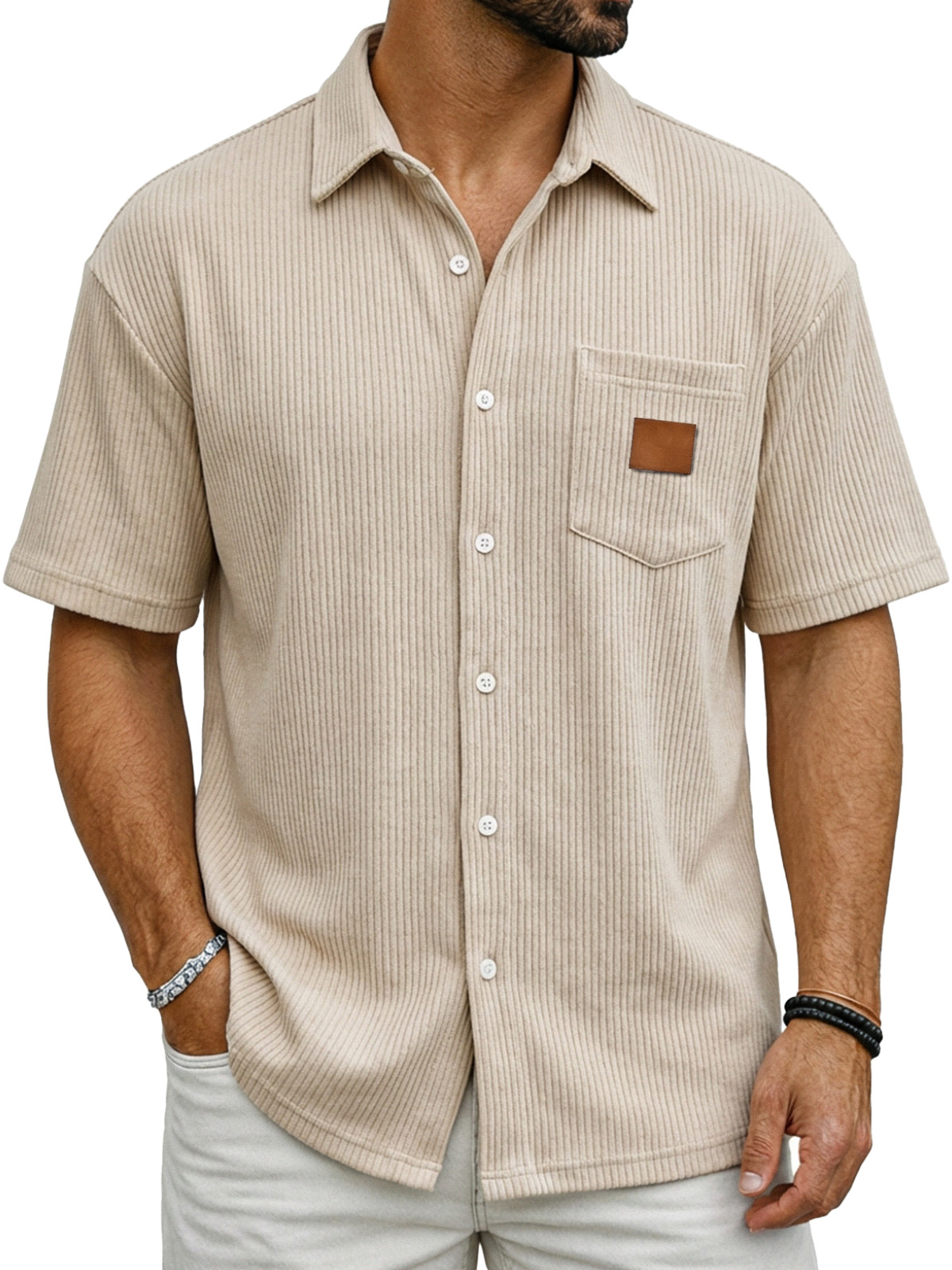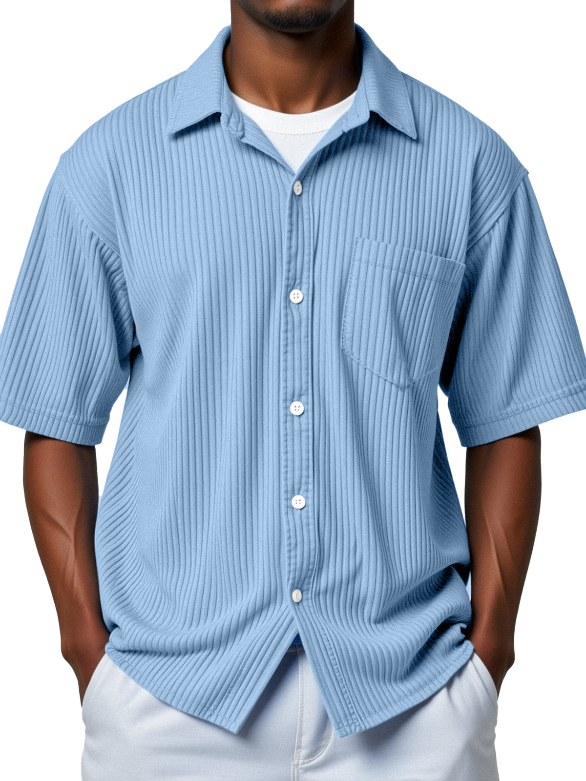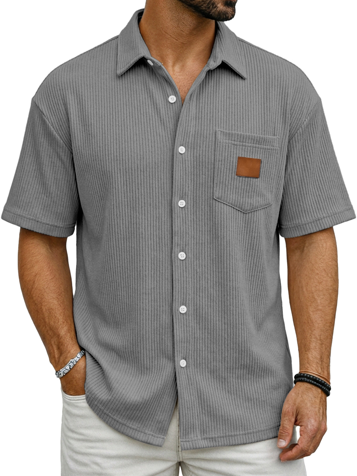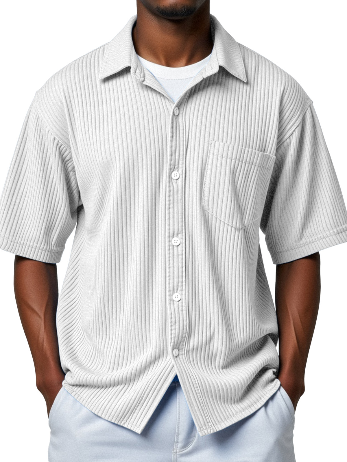 Men's Retro Solid Color Vertical Ribbed Double Pocket Short-Sleeve Shirt