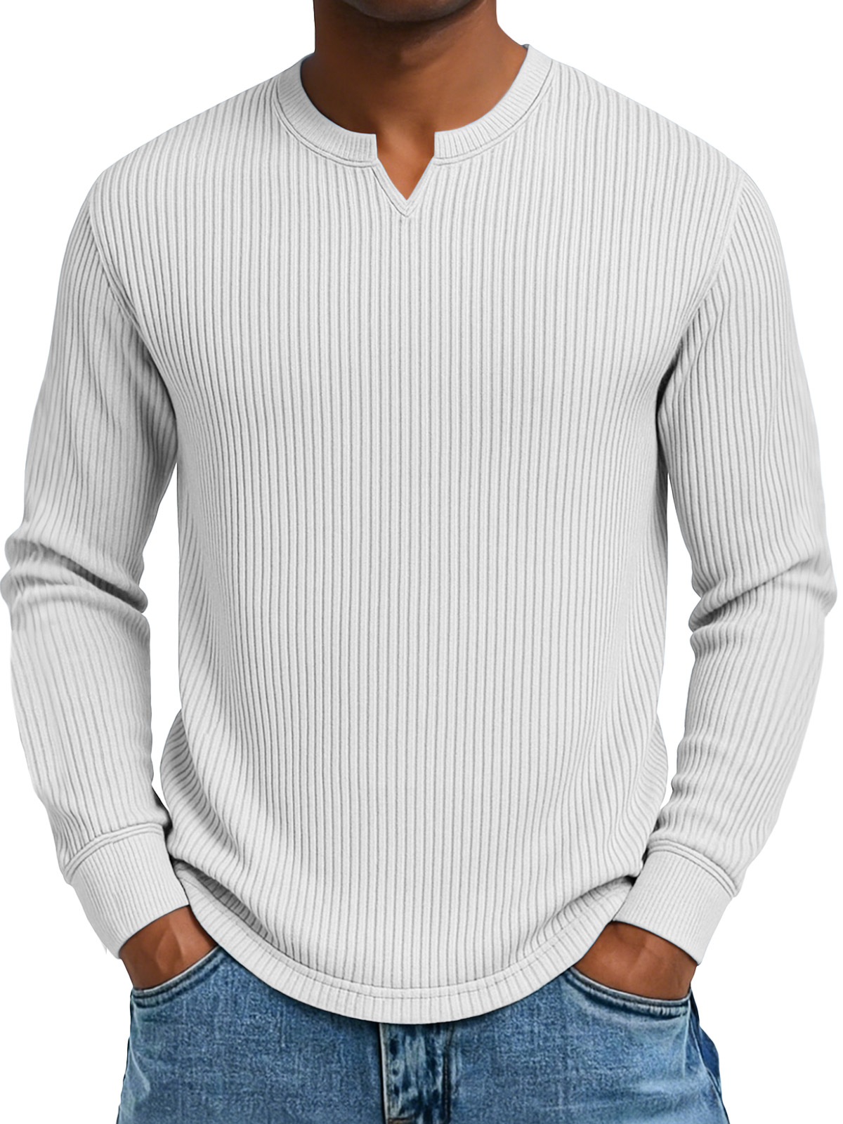 Men's Simple Vertical Ribbed Small V-neck Casual Loose Long-sleeved T-shirt