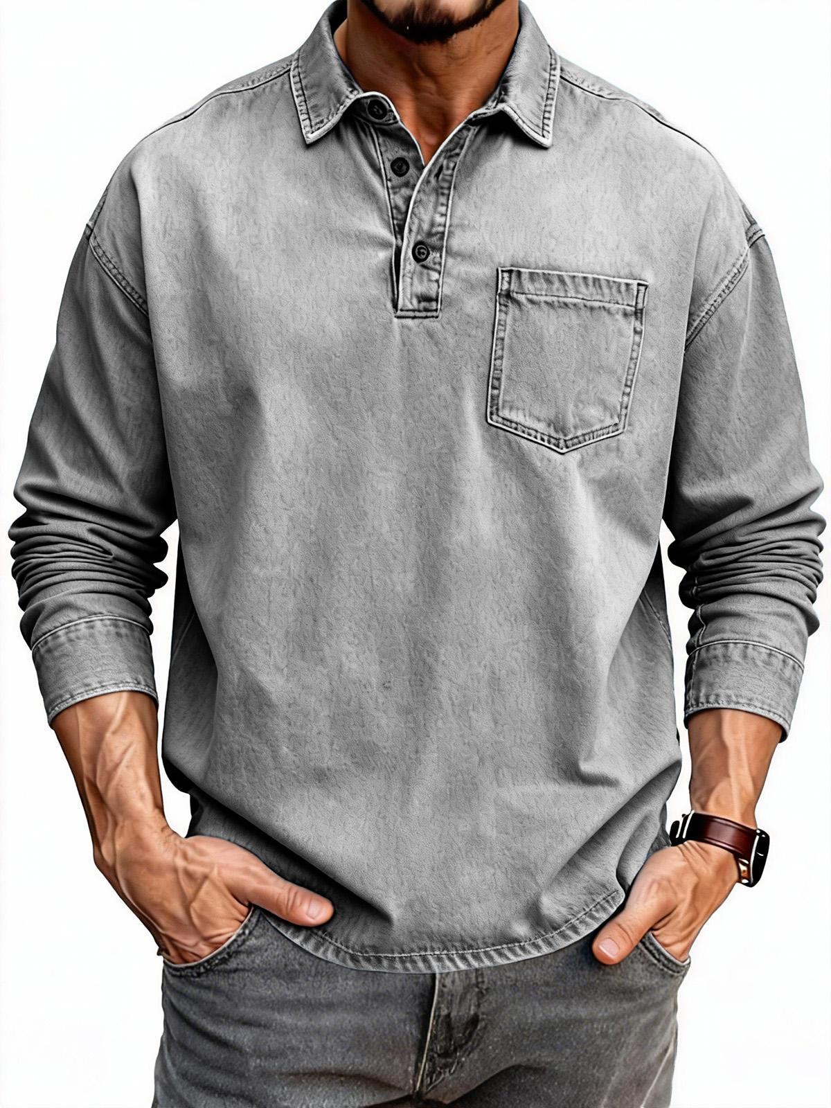 Men's Fashion Retro Distressed Lapel Pocket Long-Sleeve Polo Shirt