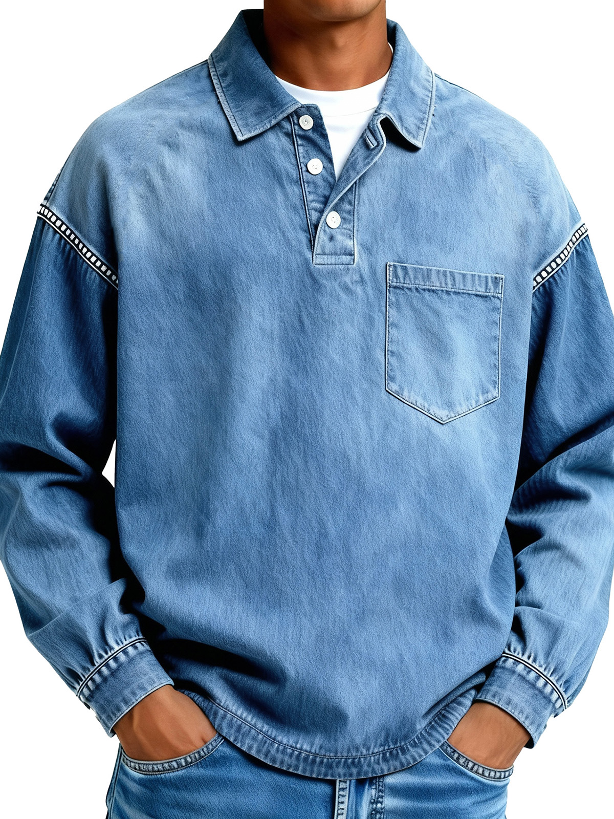 Men's Fashionable Retro Distressed Pocket Collar Long-Sleeve Polo Shirt