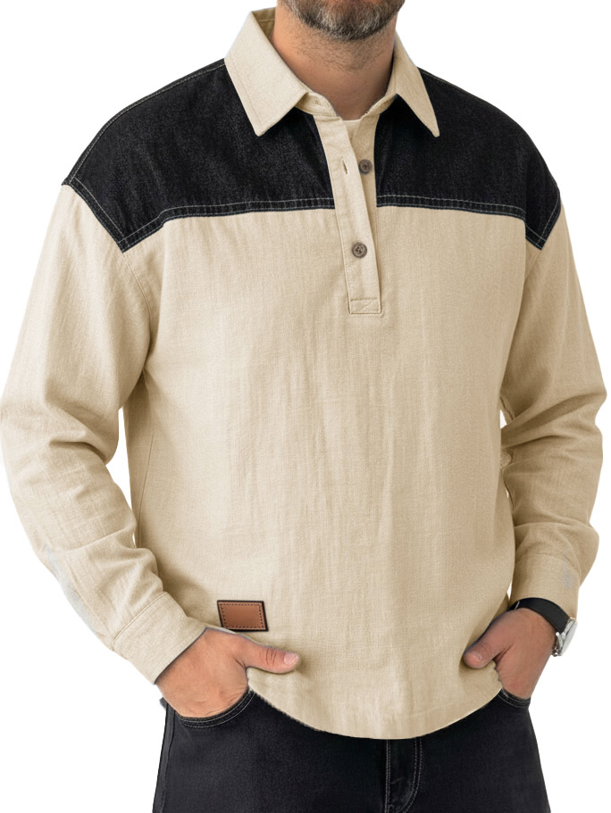 Men's Vintage Breathable Linen Denim Color-blocked Pullover Polo Shirt