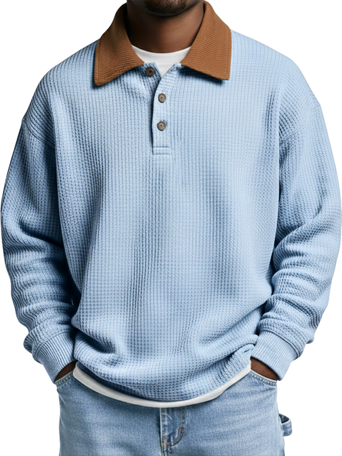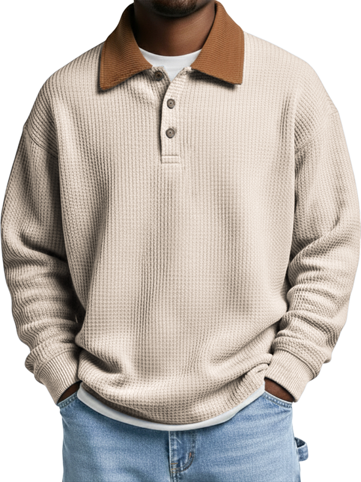 Men's Vintage Corduroy Patchwork Collar Waffle Knit Pullover Polo Shirt
