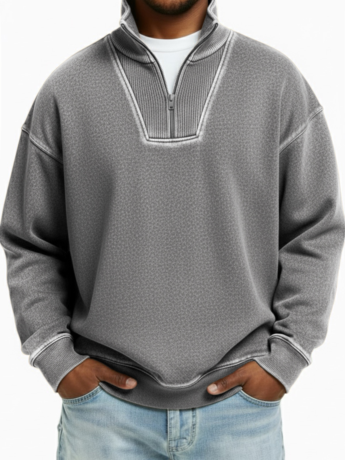 Men's Retro Distressed Collar Zip Long Sleeve Sweatshirt