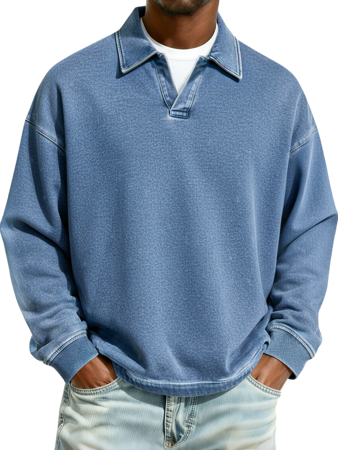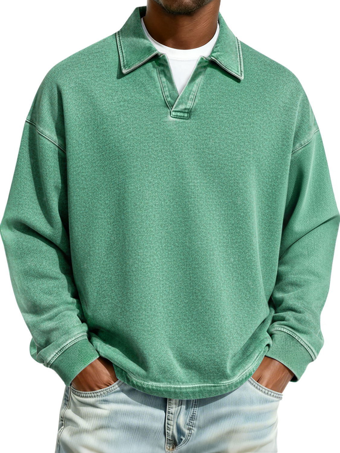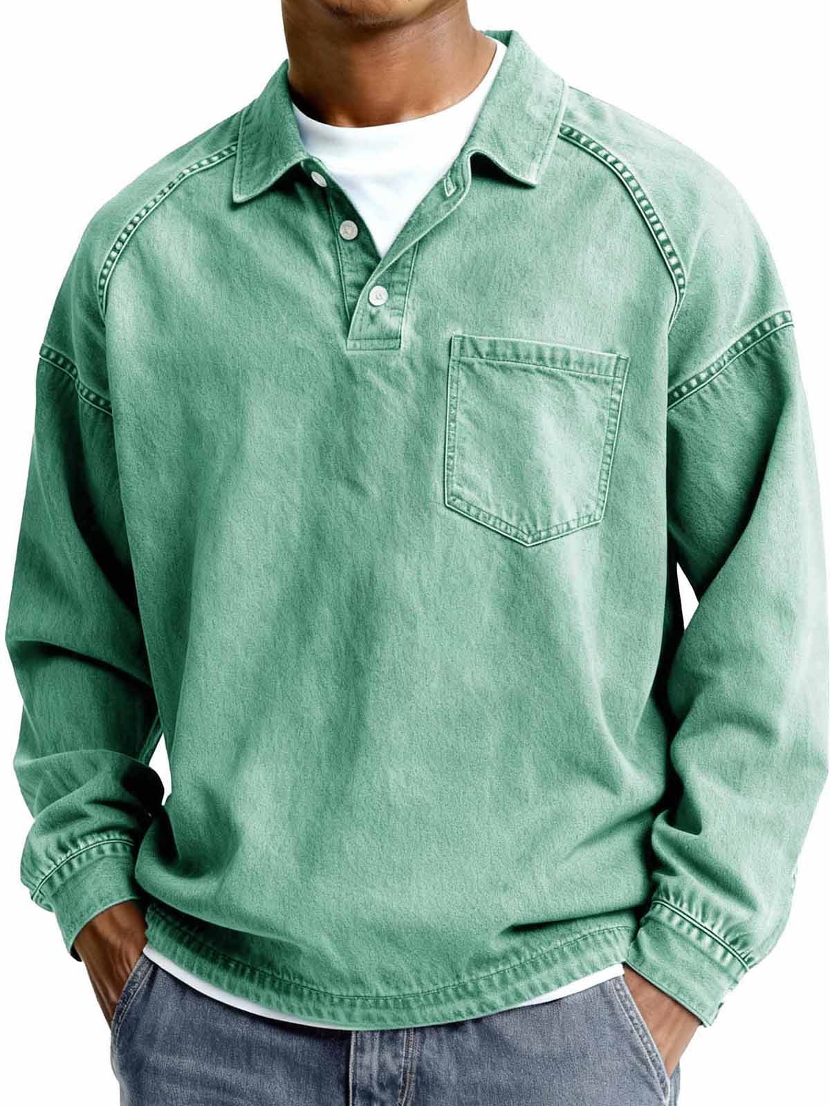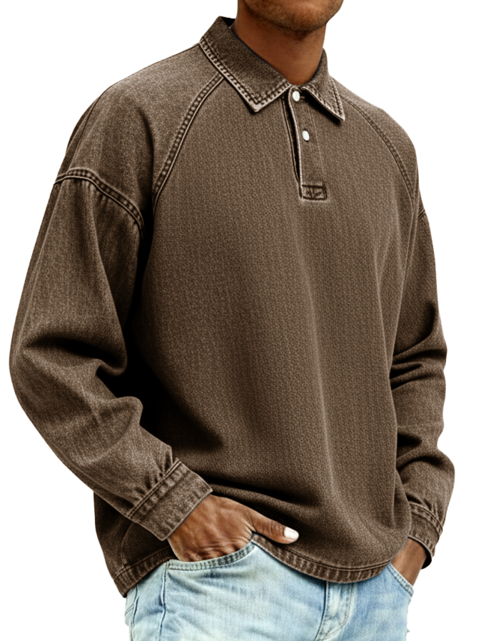 Men's Retro Fashion Distressed Turn-Down Collar Long-Sleeve Loose Polo Shirt