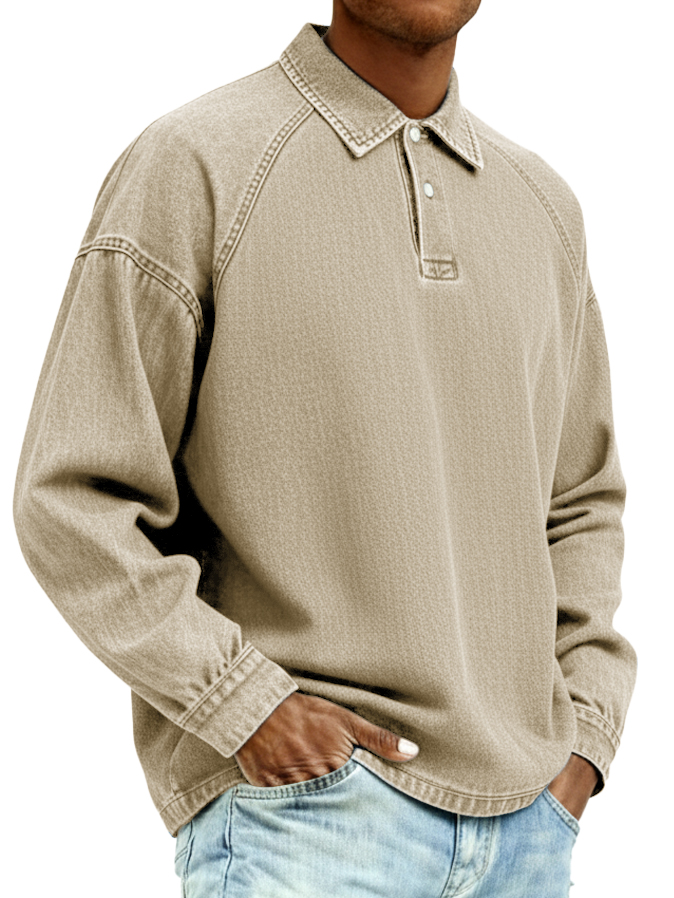 Men's Retro Fashion Distressed Raglan Sleeve Lapel Long-Sleeve Polo Shirt