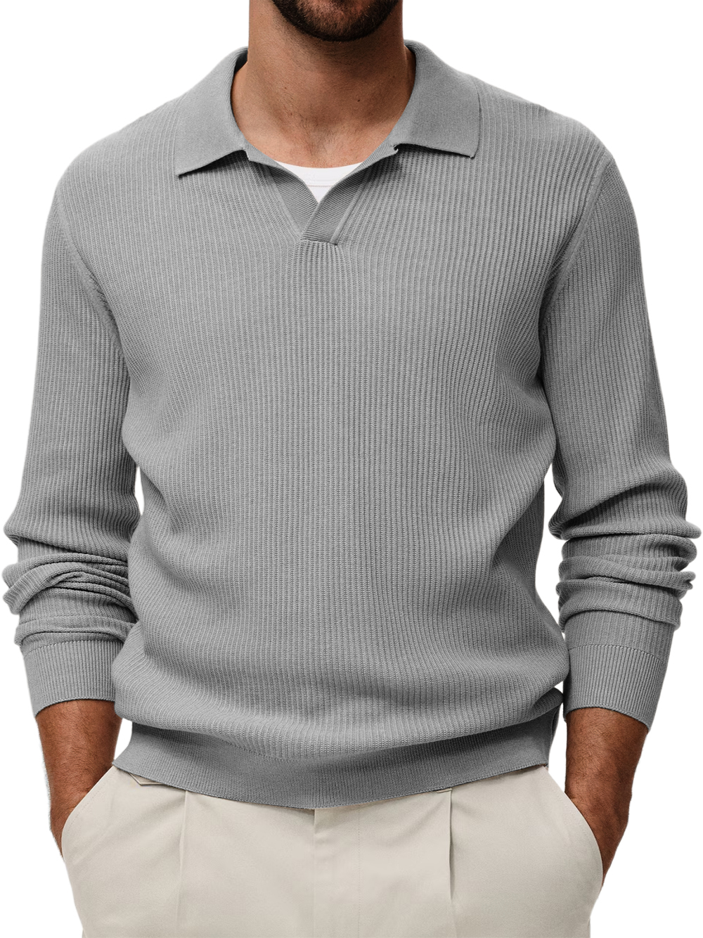 Men's Stylish Casual Padded Lapel Button-stitched Ribbed Long-sleeved Polo Shirt
