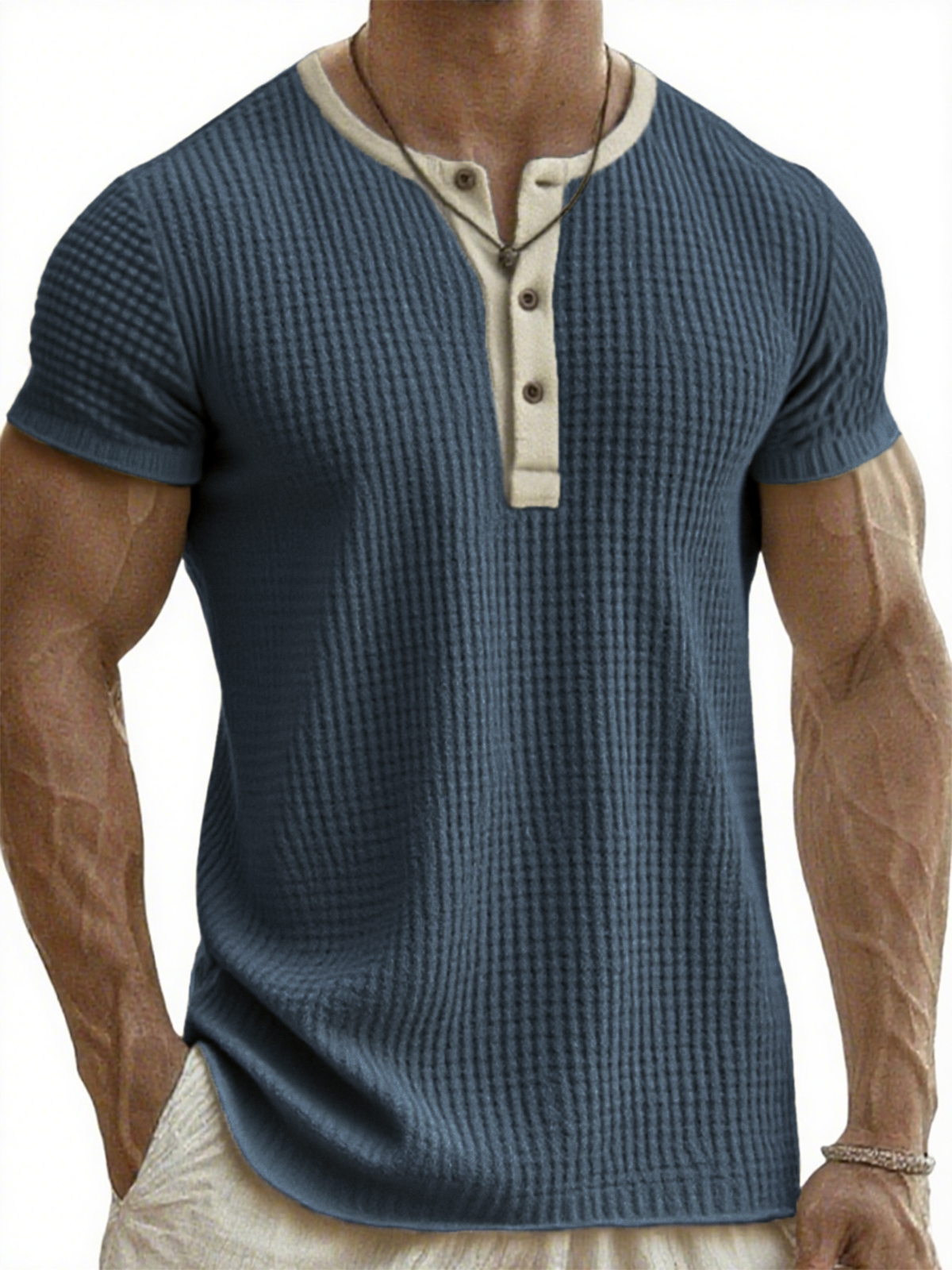 Men's Comfort Waffle Linen Breathable Henley Colorblock Top