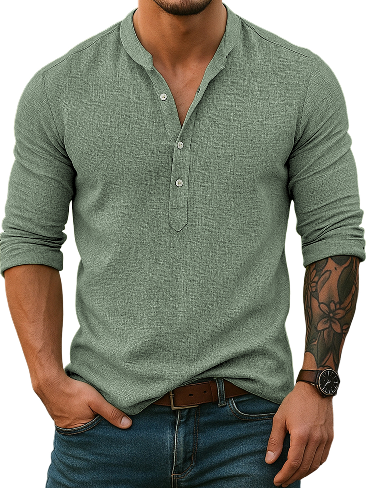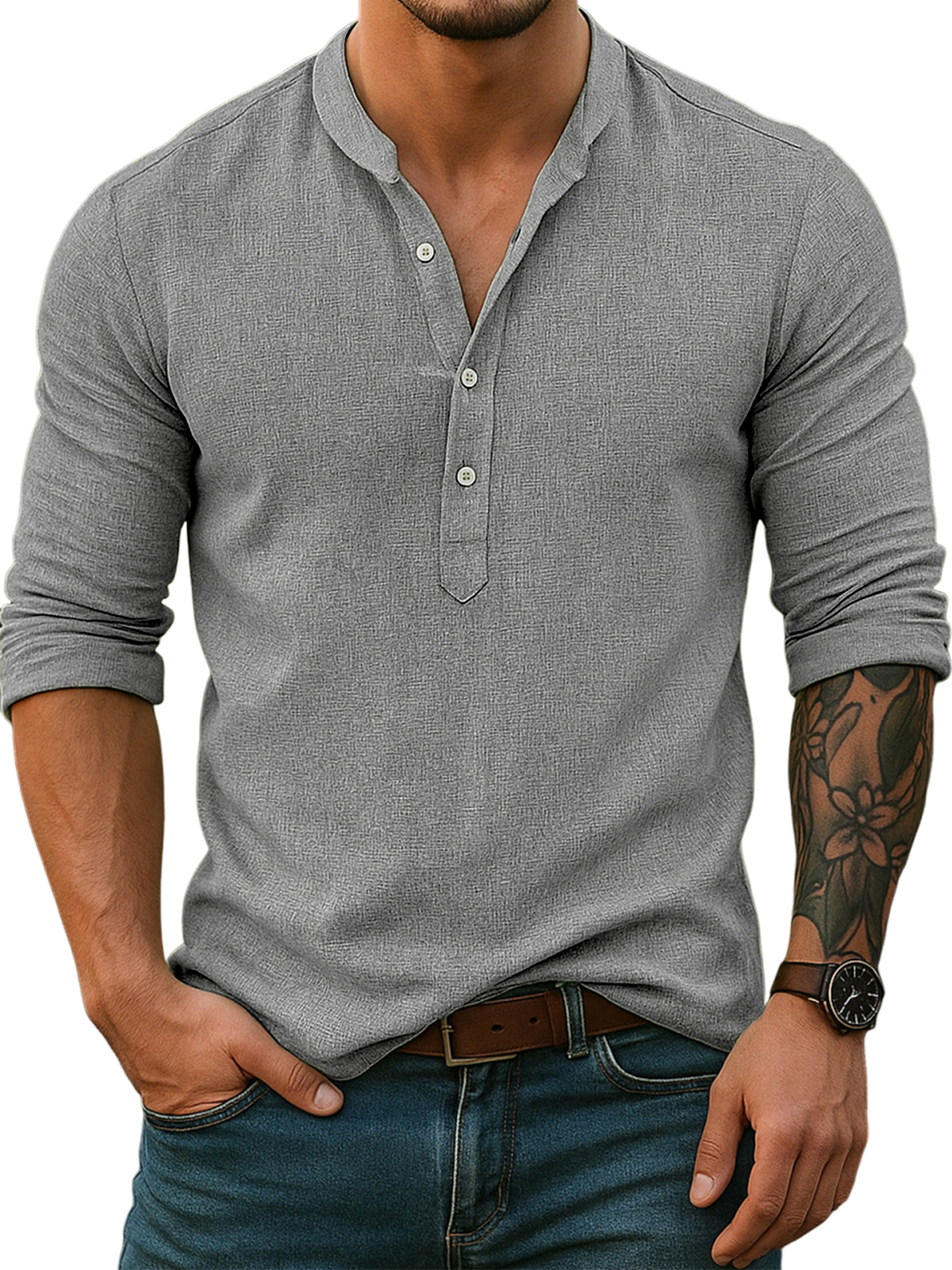 Men's Casual Fashion Basic Casual Henley Collar Cotton And Linen Long-sleeved Top