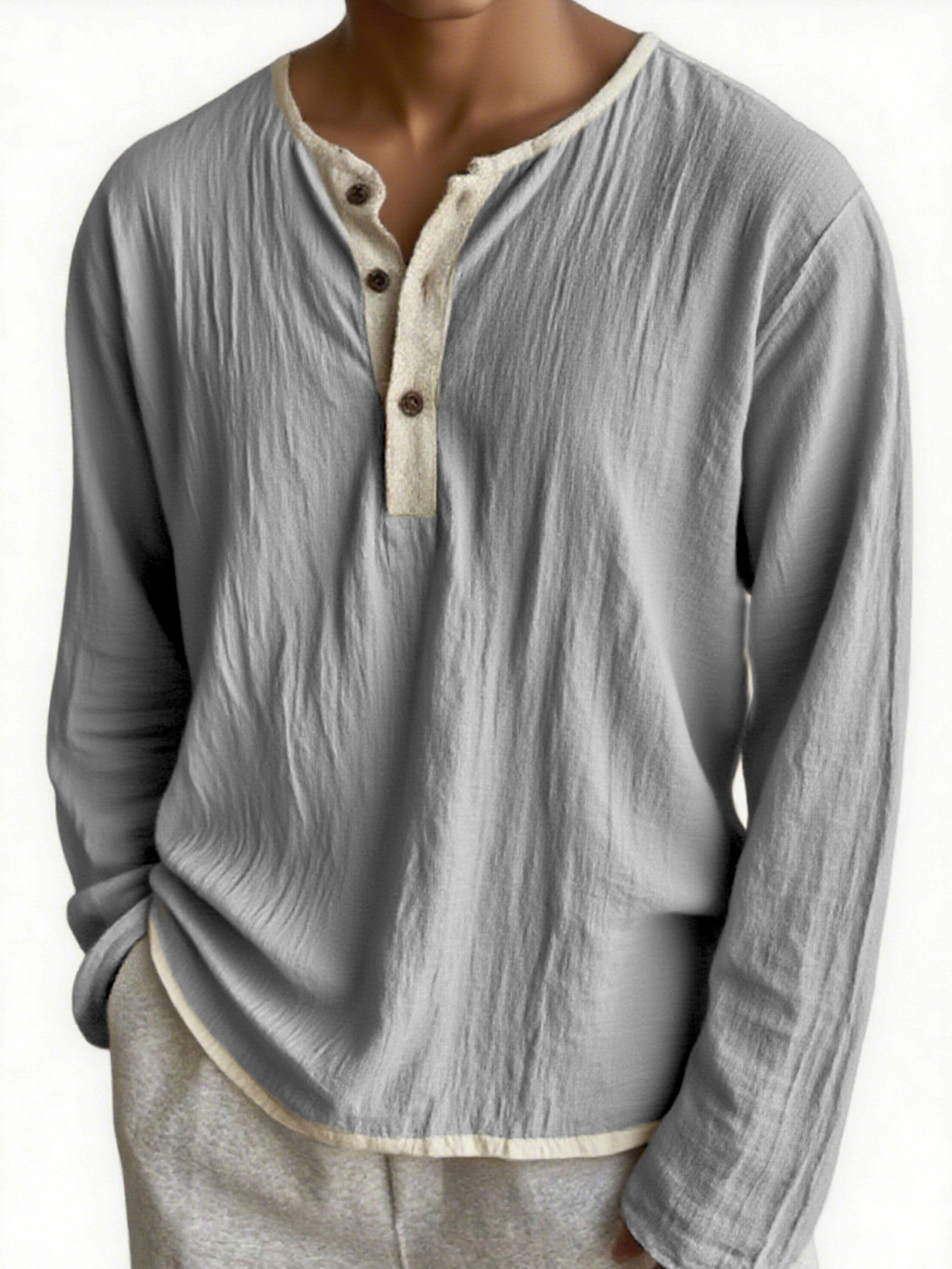 Men's Urban Casual Crinkled Linen Color-block Long-sleeve Henley Shirt