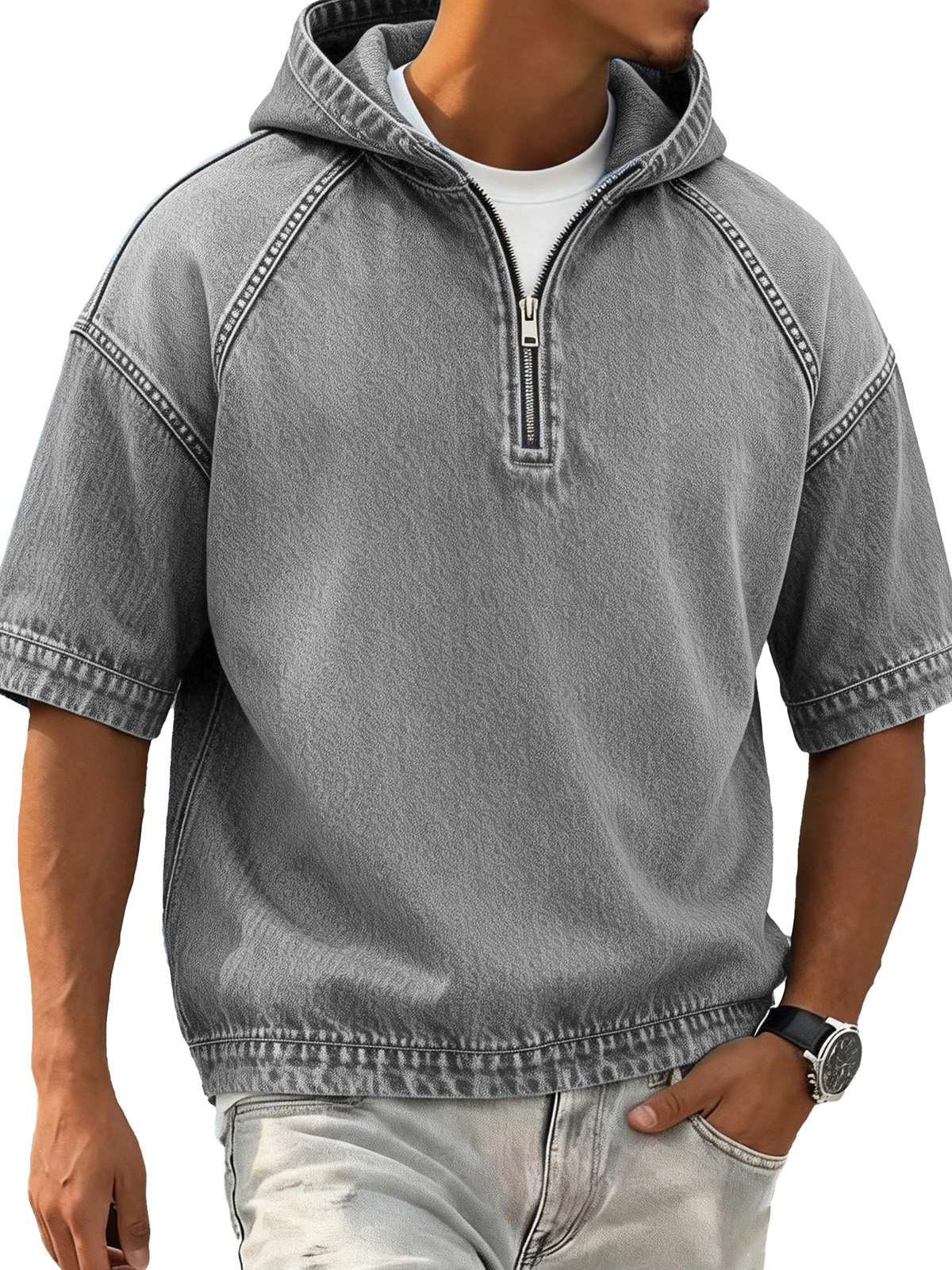 Men's Fashionable Casual Retro Hooded Short-Sleeve Zipper T-Shirt