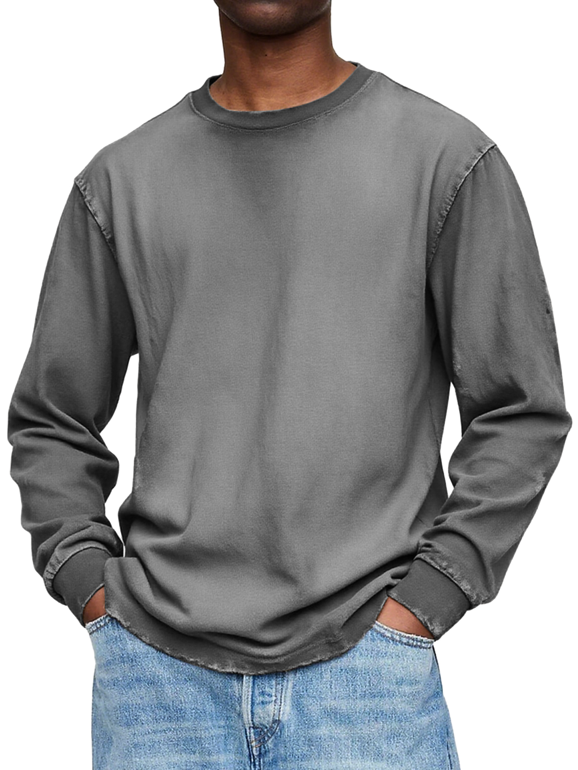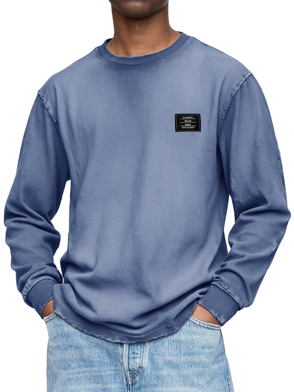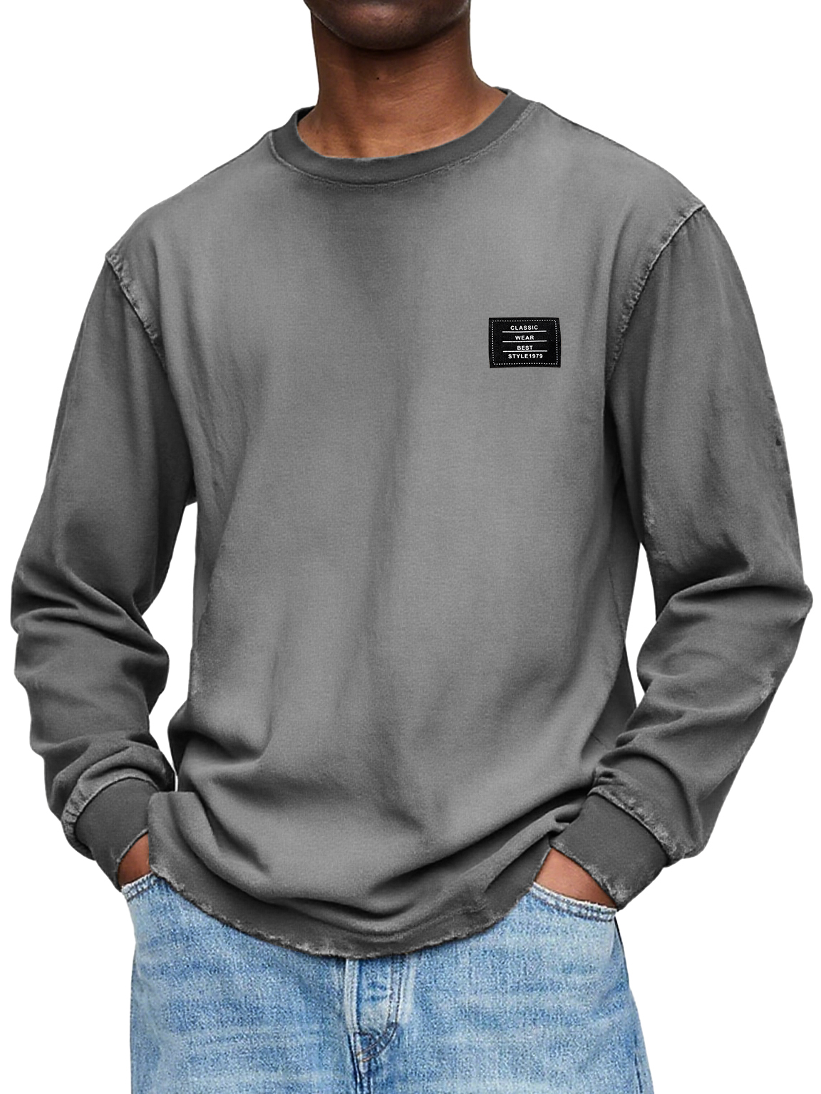 Men's Washed And Distressed Vintage Round Neck Pocket Basic Casual Long-sleeved T-shirt