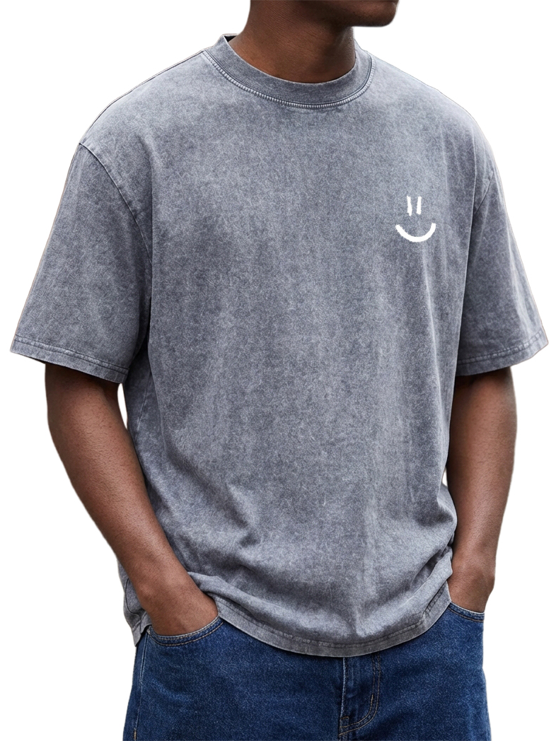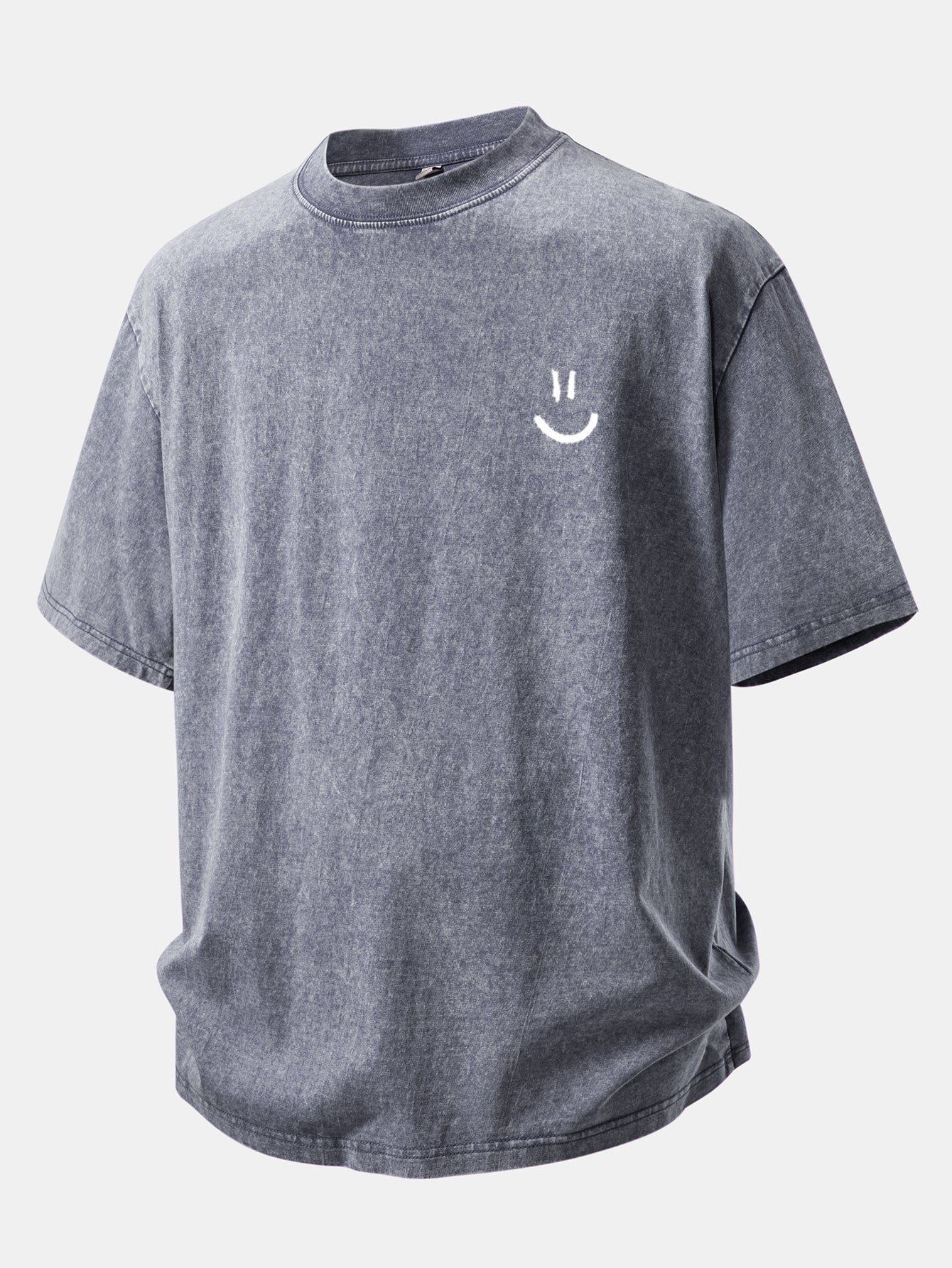 100% Cotton Vintage Washed Distressed Smiley Print Crew Neck Short-Sleeve T-Shirt