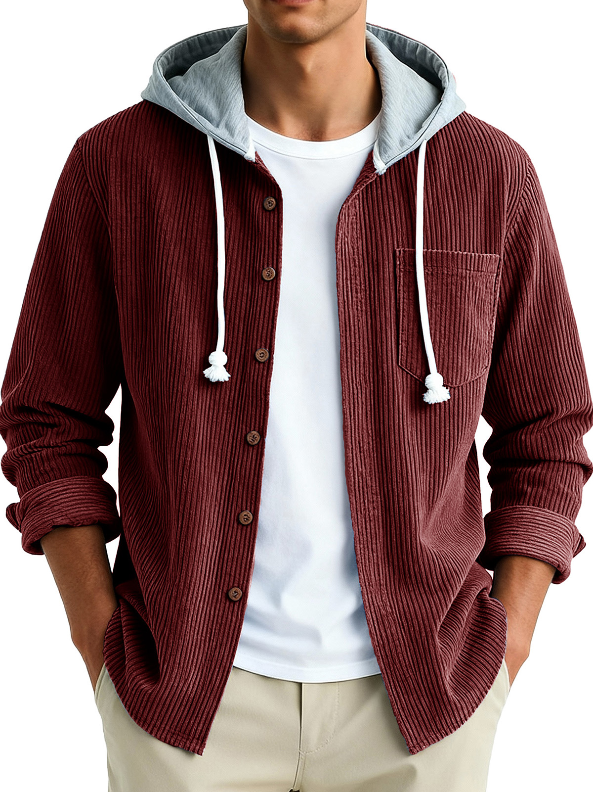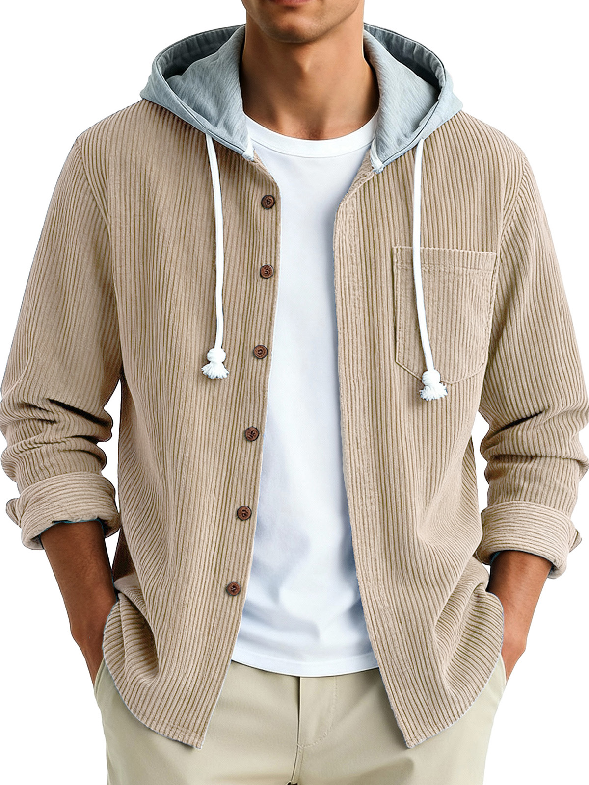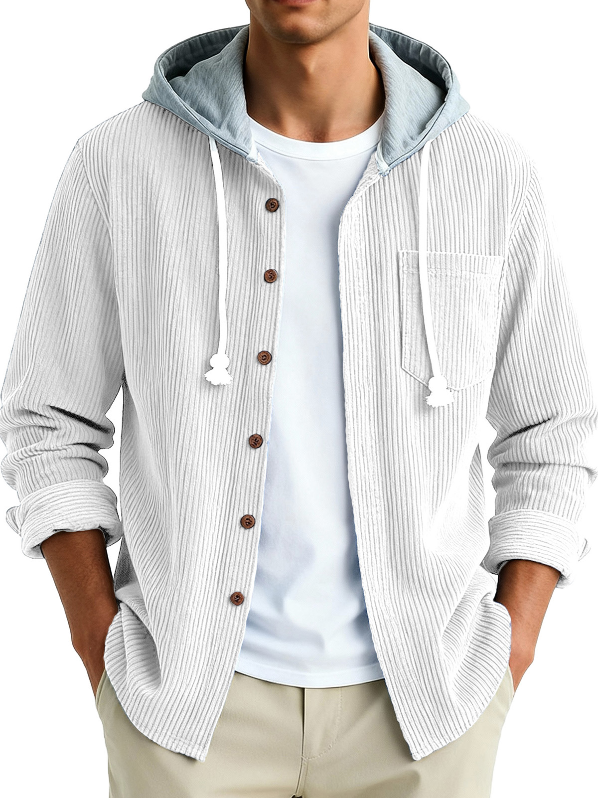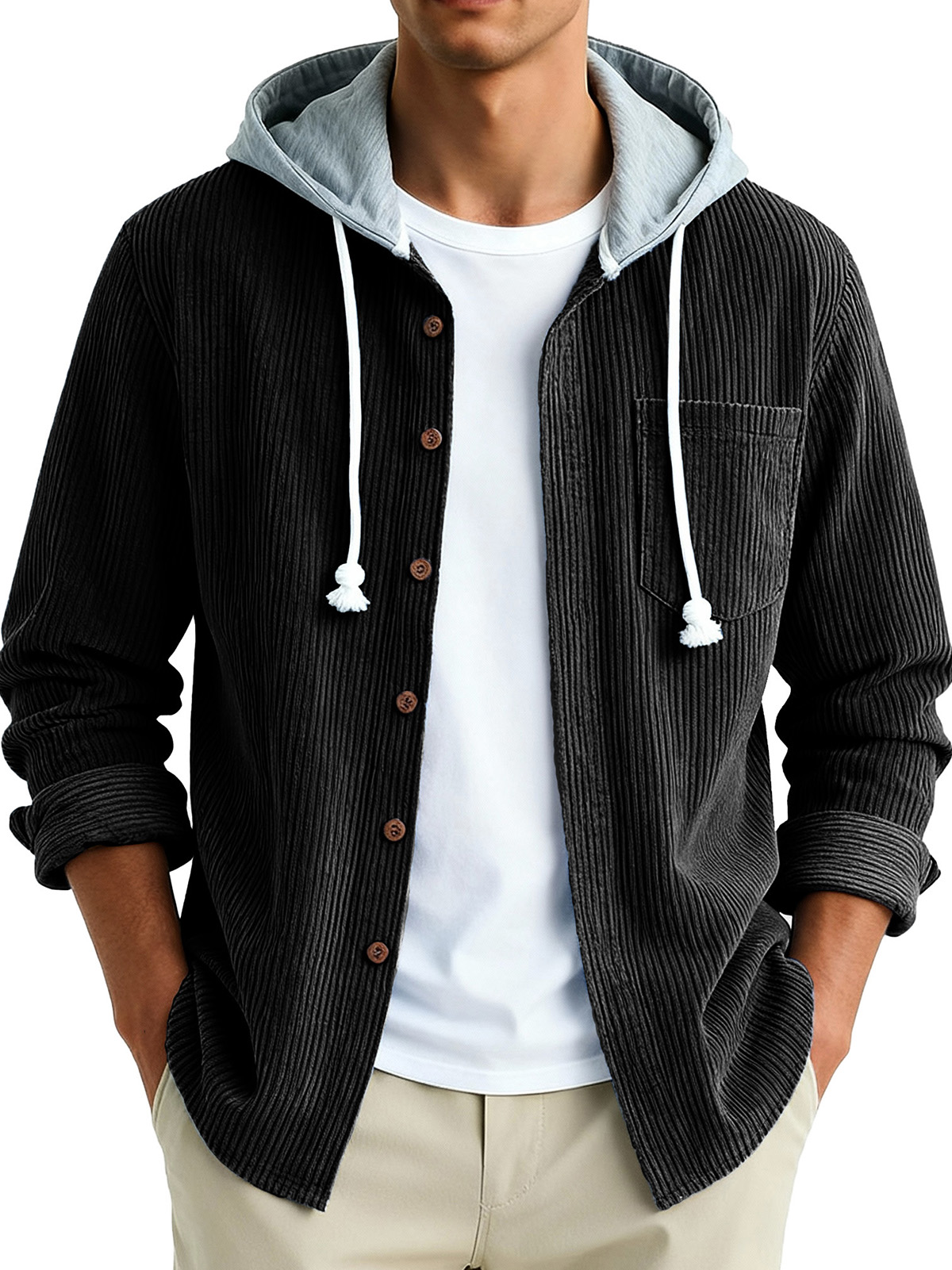 Men's Fashion Vintage Stitching Pit Strip Long Sleeve Pocket Hooded Shirt