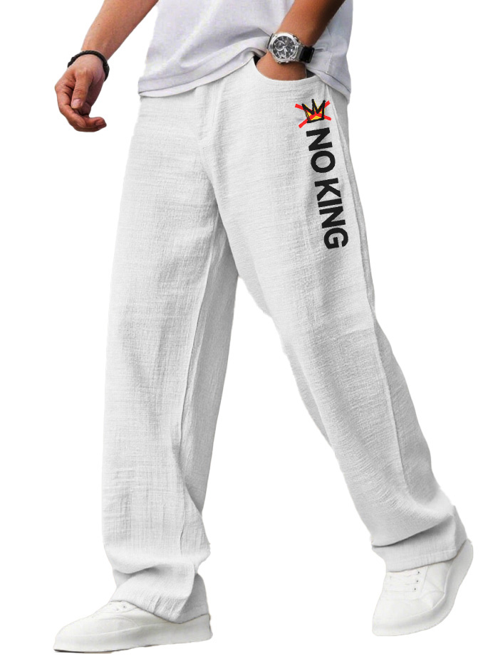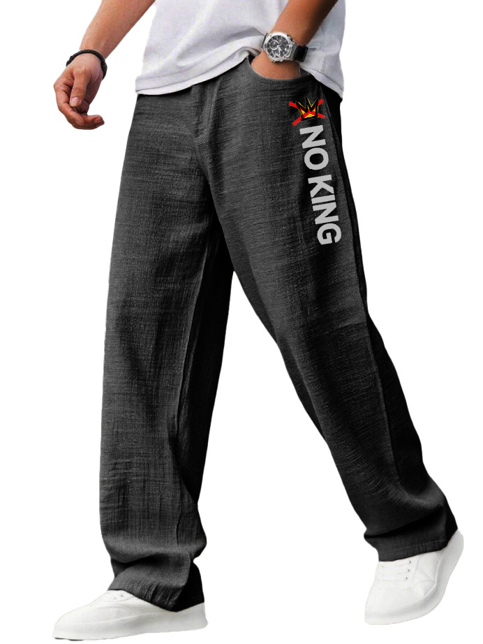 "no King" Letter-printed Casual Linen Fabric Loose Pocket Pants
